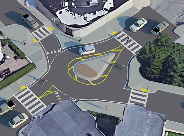 This aerial rendering shows a teardrop-shape center island and some larger curb extensions to form a roundabout in the intersection.
