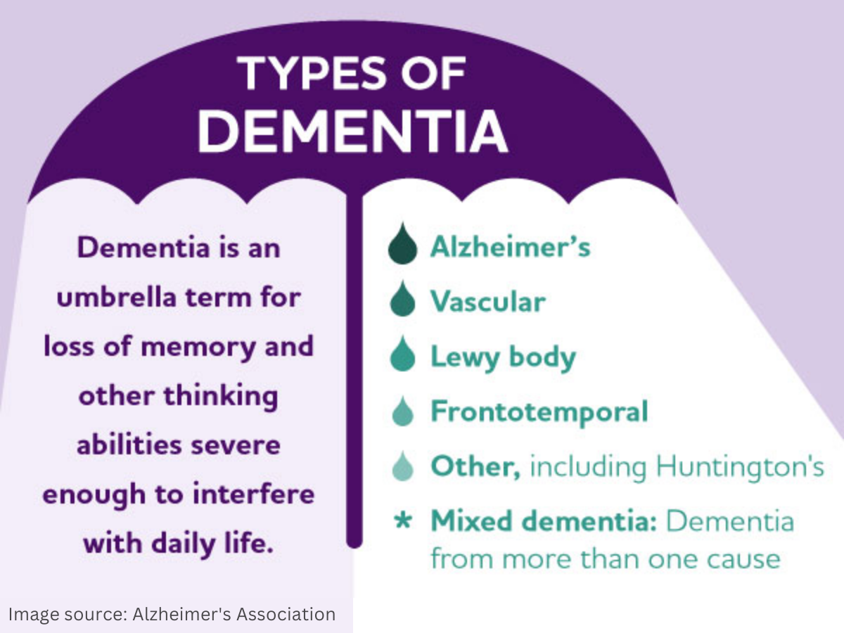 The most common type of dementia is Alzheimer's, but dementia also includes: