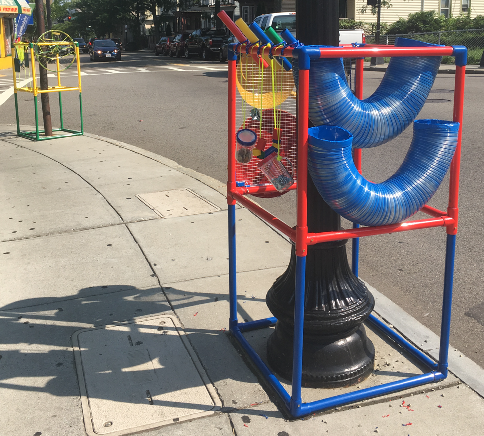 The EcoSonic Playground Project (E.P.P.) is a cross-disciplinary program developed at UMass Lowell in 2016 to address three pressing issues faced by the global learning community: Equal access to arts education, adequate support for STEAM (science, technology, engineering, arts and mathematics), and the fostering of environmentally sustainable practices. The E.P.P. creates large-scale, multiplayer, socially oriented musical instrument structures using PVC pipes and recycled materials found locally. At the Geneva Avenue and Westville Street bus stop, the E.P.P. references traditional Vietnamese folk instruments. Creator Elissa Johnson Green envisions this project positively contributing to the life of the neighborhood through improvisation and collaborative music making fostering creativity, promoting inclusivity, and ecological awareness.
