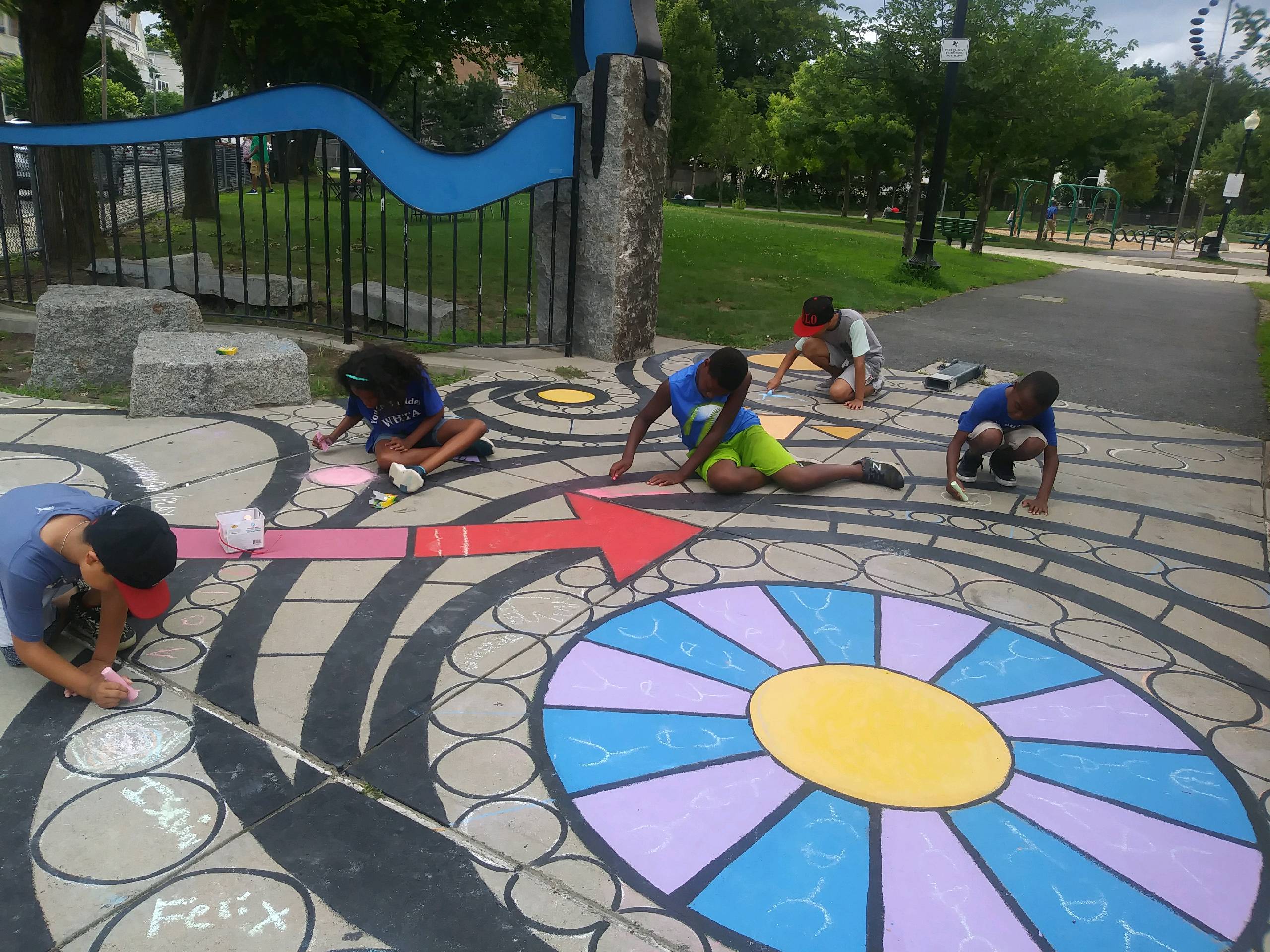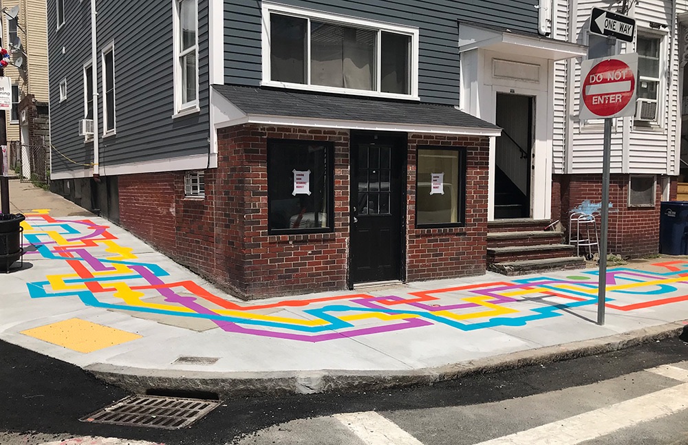 Mystery Map, by local artist Liz LaManche, is made of four sets of colored lines punctuated by circles, encouraging more than one participant at a time to puzzle out the best ways to follow the map or create their own games using it as a board. Liz LaManche, who has created several Public Art pieces throughout East Boston and the greater Boston area, emphasized simplicity to allow people of any age to enjoy and interact with the map in their own way.