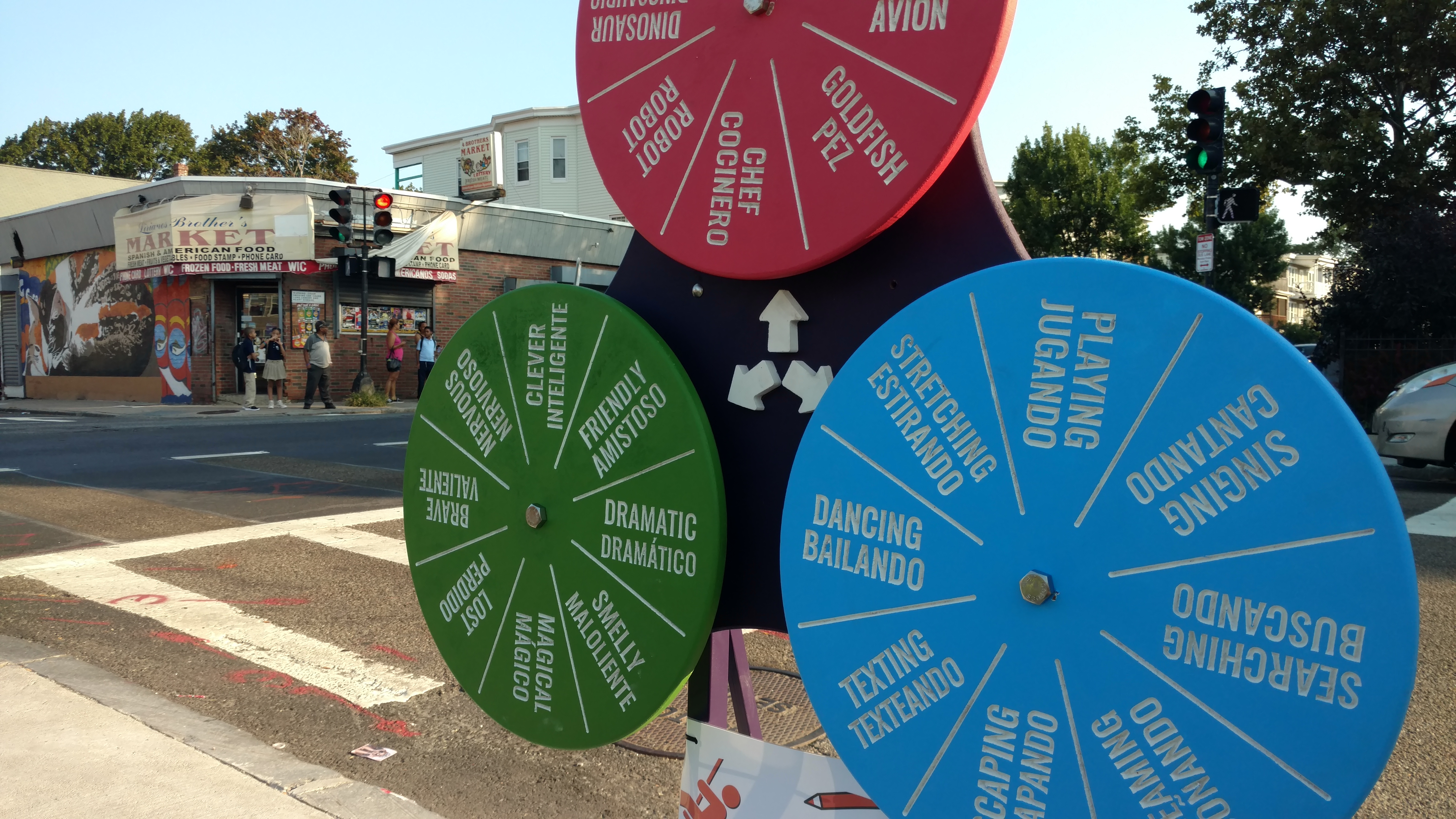 Words on the Street, designed for the Washington Street @ Archdale Road location is composed of three spinning “prize” style wheels with nouns, adjectives, and gerunds in both English and Spanish. Individuals spin the wheels to create phrases that can be acted out and offer opportunities to learn and ask questions. Roslindale Wants to Play is an entirely volunteer-run organization of Roslindale residents deeply invested in their community and making it more playful.