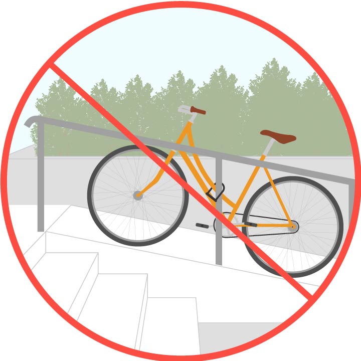 Locking your bike to handrails or a ramp can prevent people, especially those who are using wheelchairs or strollers, from getting past your bike.