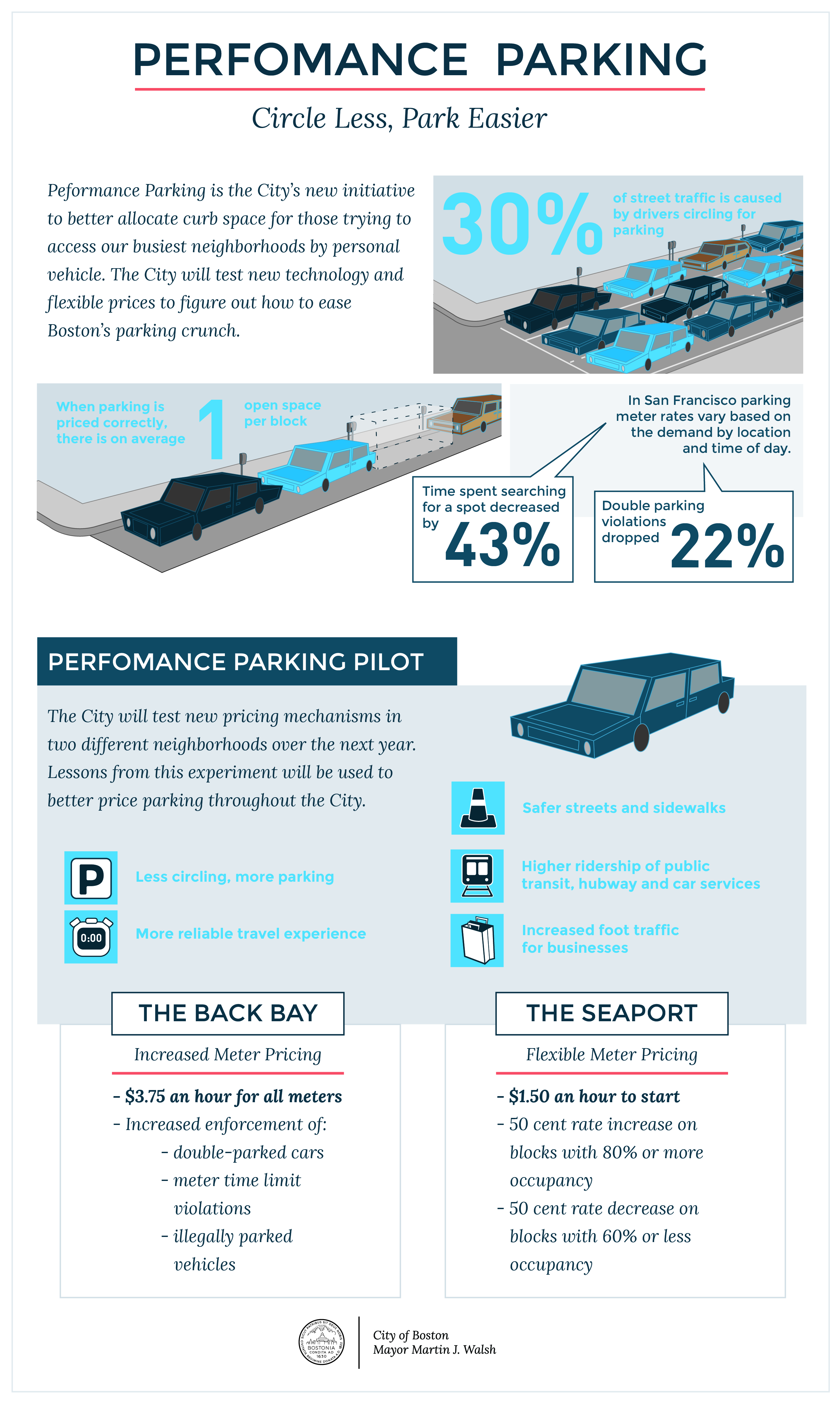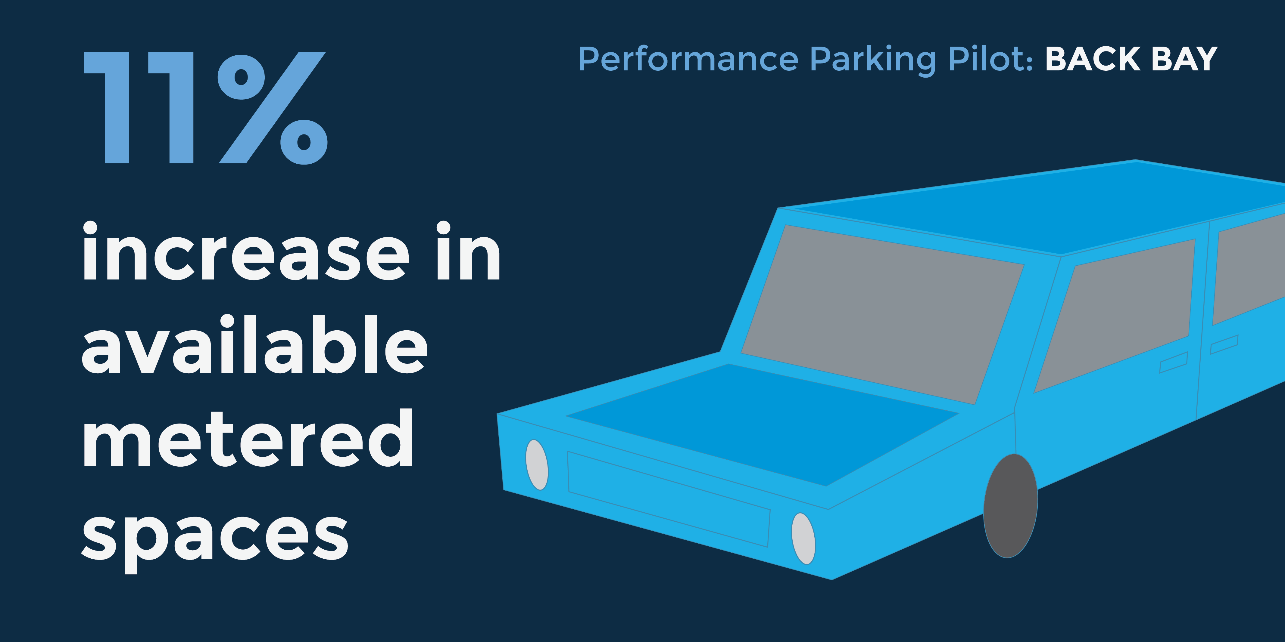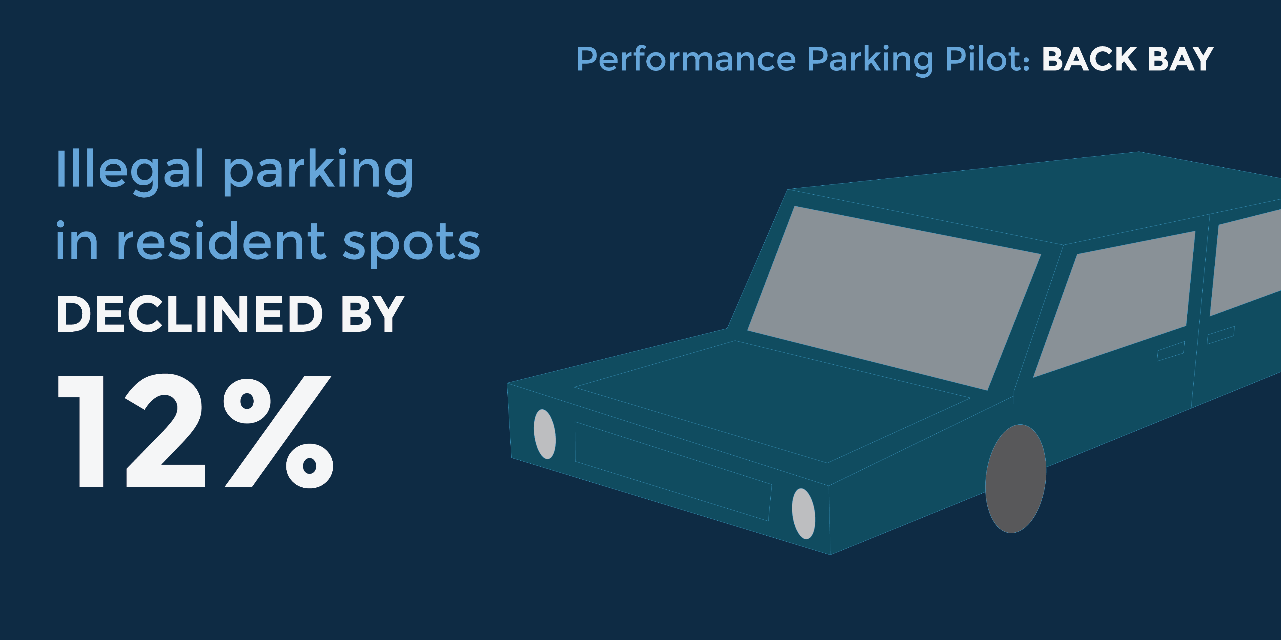 • The performance parking pilot also increased parking availability for neighborhood residents. Illegal parking in a resident spot declined by 12 percent in the Back Bay and by 35 percent in the Seaport.