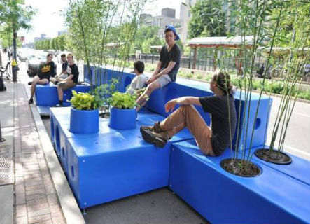 Public parklets are small public seating areas where people can eat, rest, and socialize on repurposed street space.