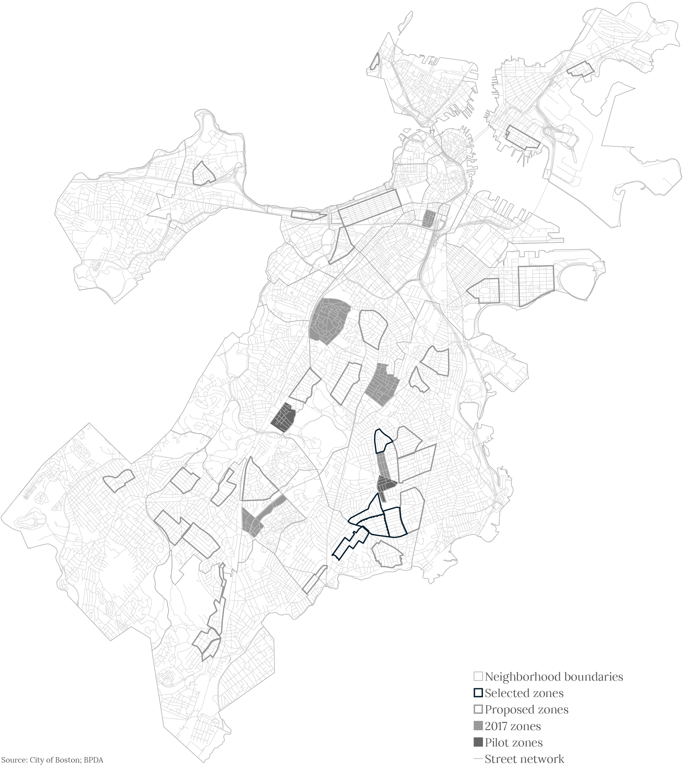 The Boston Transportation Department received applications for 37 zones by the August 24 deadline. Each community that submitted an incomplete application was given 5 additional days from the time of notification to provide the necessary materials. During this round of evaluations, 33 zones were considered for selection, including 17 communities that applied in 2017 (marked with an asterisk below).
