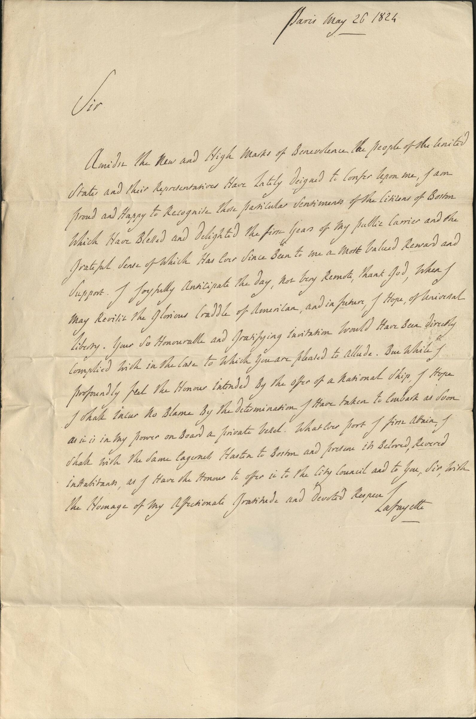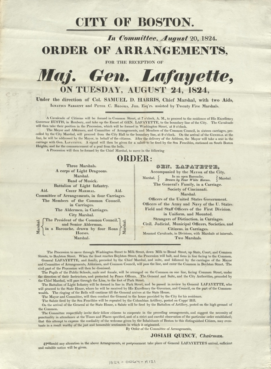 Mayor Josiah Quincy and members of the Boston City Council formed a committee to plan events and provide lodging for Lafayette during his visit to Boston. In the City Archives, we have a small exhibit on display of some of the documents relating to Lafayette’s visit to Boston in 1824. Documents include correspondence between Mayor Quincy and Lafayette, bills for services rendered, order of arrangements for the grand parade, and correspondence from residents of Boston expressing their excitement about Lafayette’s visit. If you are in the neighborhood, we welcome you to stop by 201 Rivermoor to view the exhibit! We are open Monday through Friday from 9:30 a.m. to 4:00 p.m.