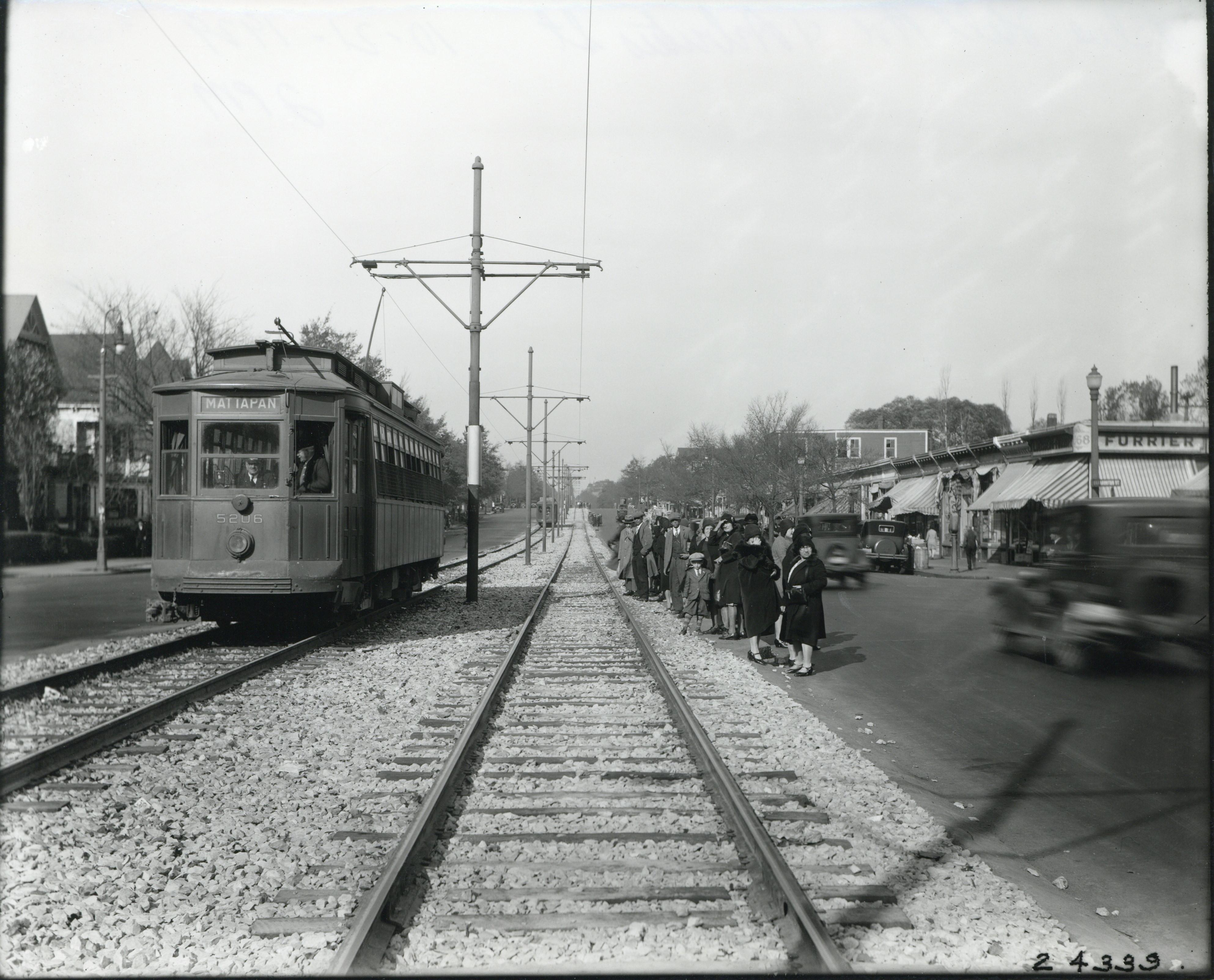 In addition to the subway and elevated rail, a large network of trolley lines connected Boston's neighborhoods. The trolley lines in the map above are indicated with the yellow lines. Bostonians used trolleys to travel in their local neighborhoods and to make connections to high-speed transit lines. This photo shows Bostonians waiting for a trolley on Blue Hill Avenue in 1929.