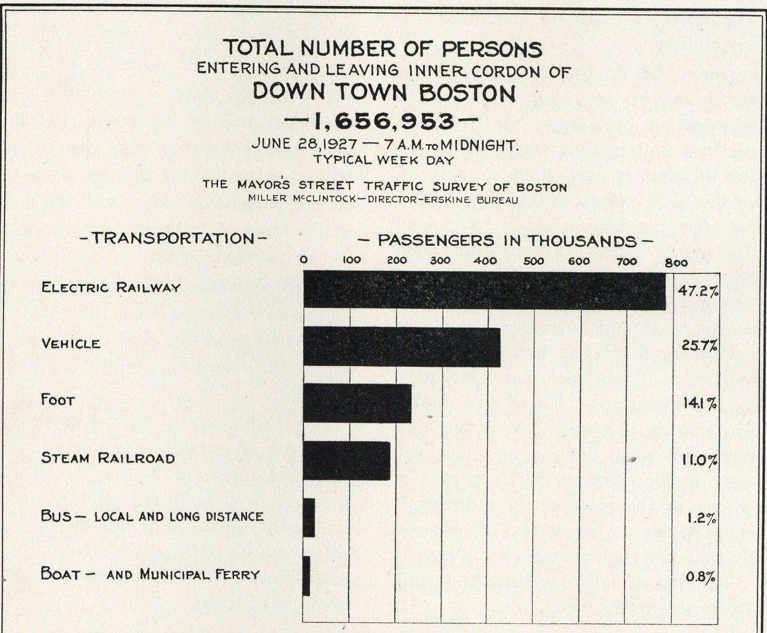 In 1930, almost 75% of the people traveling in and out of downtown Boston either used this public transit system or walked. This 1927 graph shows the modes of transportation that people used to enter and exit Boston’s downtown area.