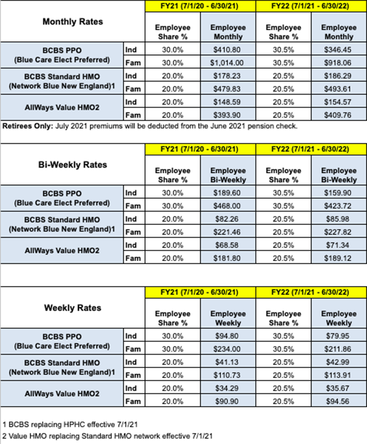 If you do not take action during the Annual Enrollment period, you will be automatically enrolled in the new Blue Cross Blue Shield Standard (BCBS) HMO plan (Network Blue New England) effective July 1, 2021.