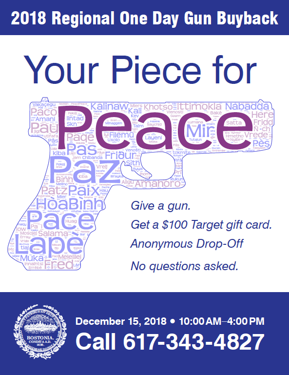 Mayor Martin J. Walsh and Boston Police Commissioner William Gross, in collaboration with physicians and medical professionals, today announced a coordinated gun buyback day will take place in six locations across Boston on Saturday, December 15 from 10 a.m. - 4 p.m. The day marks a remembrance of the victims of the Sandy Hook Elementary School shooting, which happened six years ago on December 14. The "Piece for Peace" program aims to bring attention to the devastating toll that unneeded and unsecured guns can have on individuals and the public at large, and provides the opportunity for people to turn in unwanted guns and ammunition, no questions asked.