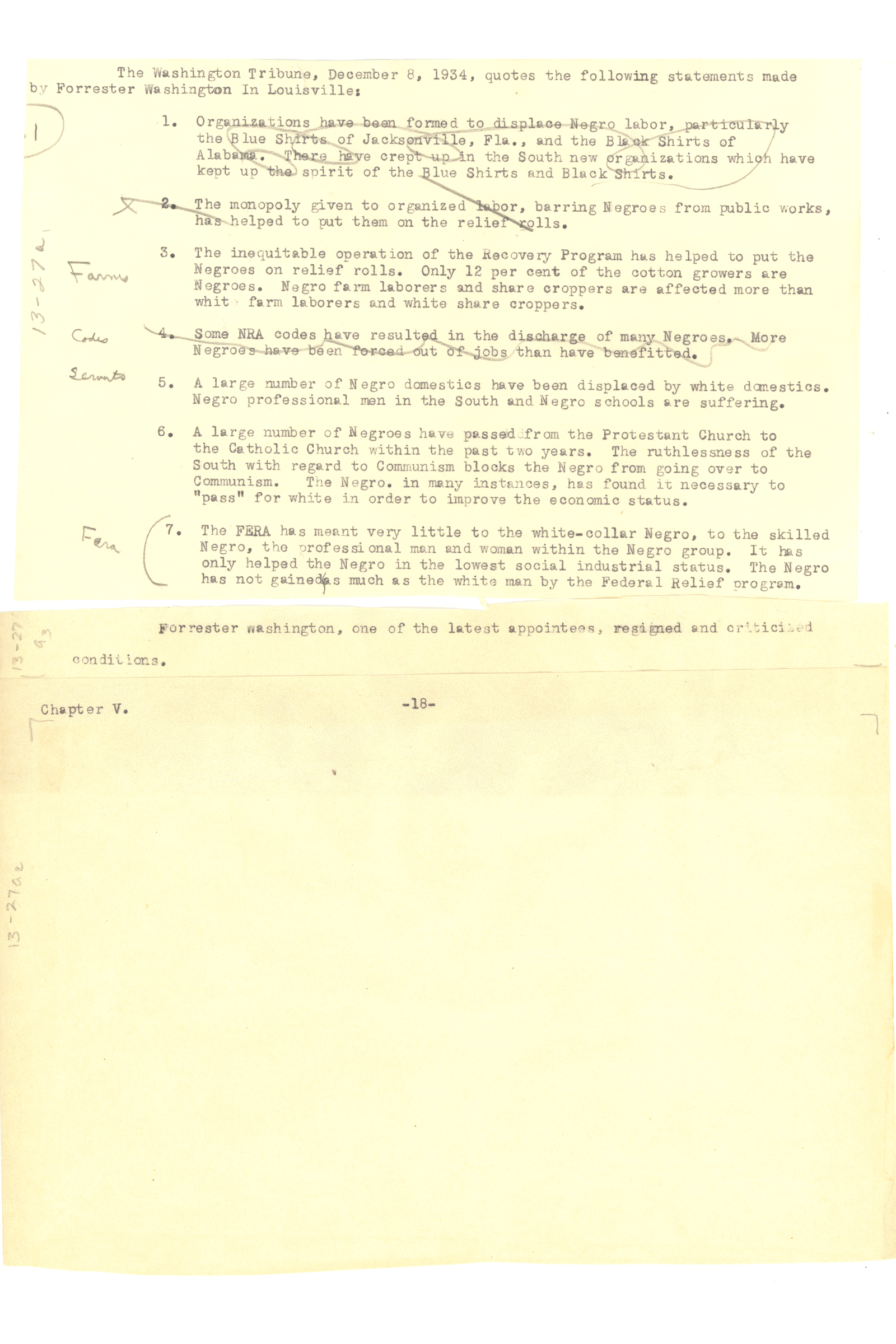 During the Great Depression, President Franklin Roosevelt appointed Forrester as the Director of Negro Work in the Federal Emergency Relief Administration (FERA). In this position, Forrester called attention to the unequal treatment of African Americans by both the government and white employers. He argued that the federal government should ensure that African Americans had equal educational and employment opportunities. Below is a set of statements from Washington about FERA and other labor related programs.