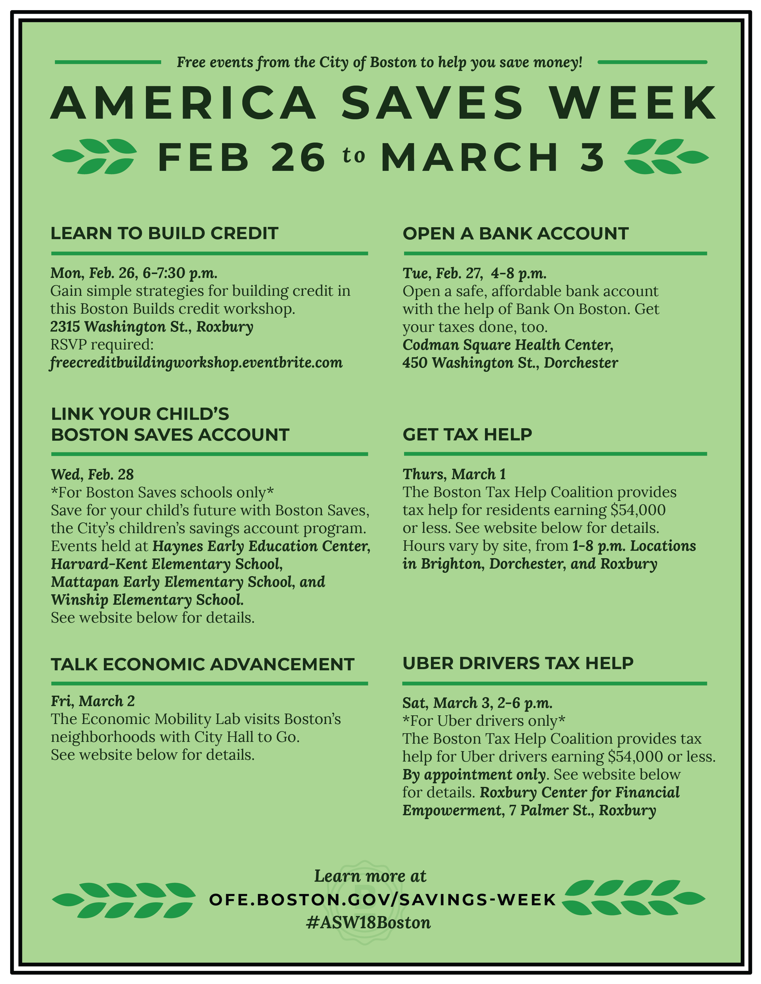 For a full schedule of Boston's America Saves Week events, please visit ofe.boston.gov/savings-week.