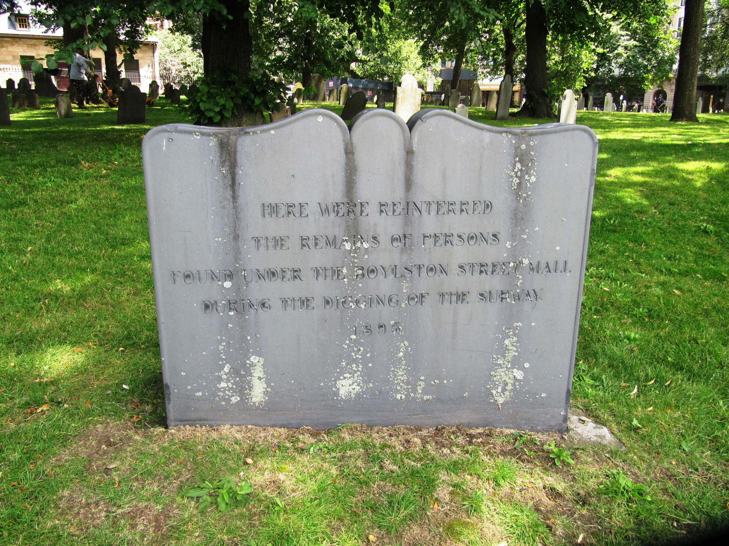 The dead rested tranquilly in Central Burying Ground for the next 45 years until new technology in the form of the subway disturbed the peaceful site. The first subway in the nation ran along Boylston Street in front of Central Burying Ground, right under the Boylston Street Mall. In order to accommodate the subterranean tunnel, any remaining tombs from the double row running under the Mall needed to be removed. Excavations started at the end of 1894. Realizing that human remains would be unearthed, the contractor, Jones & Meeham, hired Dr. Samuel Green, a librarian at the Massachusetts Historical Society, to be in charge of insuring the respectful reinternment of the bones. An undertaker was hired to perform the reinternments. The number of human remains found was much greater than originally anticipated. Work crews dug a hole in the burying ground to accommodate the found human remains, which were placed in small boxes.