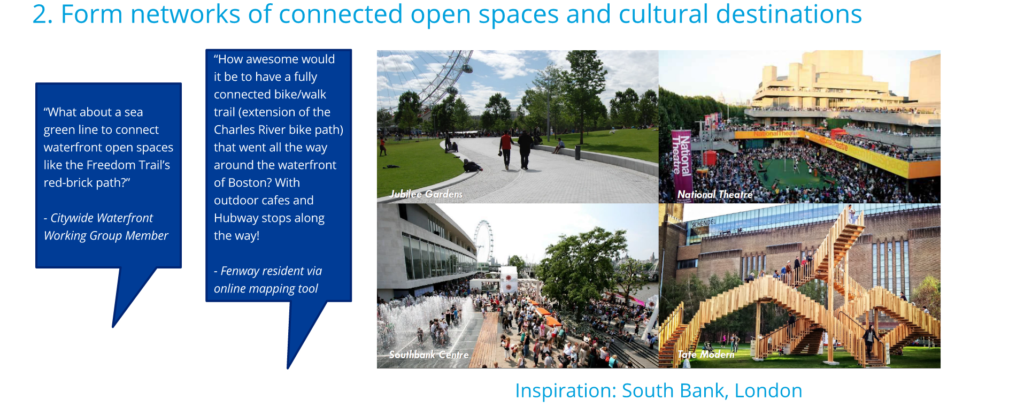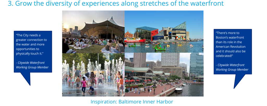 - An activated waterfront is anchored by varied types of open spaces, featuring cultural resources and year-round programming and connecting people with the natural, cultural, and economic history of the region.