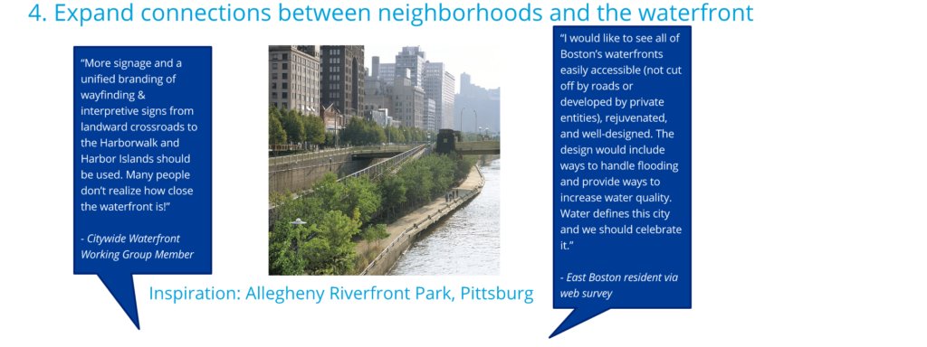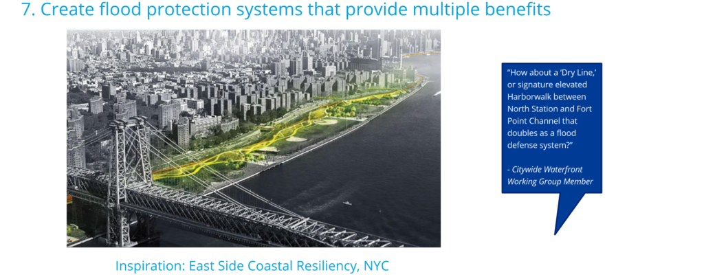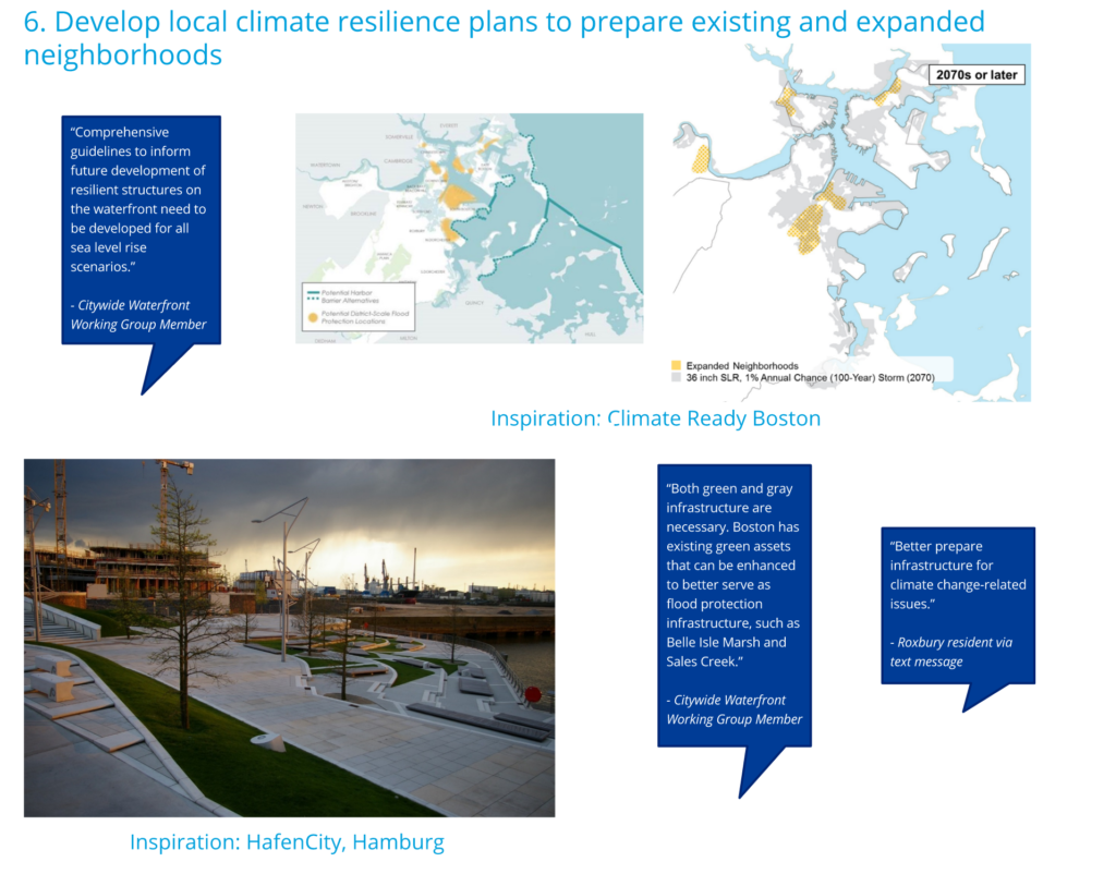 - A climate-ready waterfront prepares Boston for climate-related risks, particularly coastal and riverine flooding.