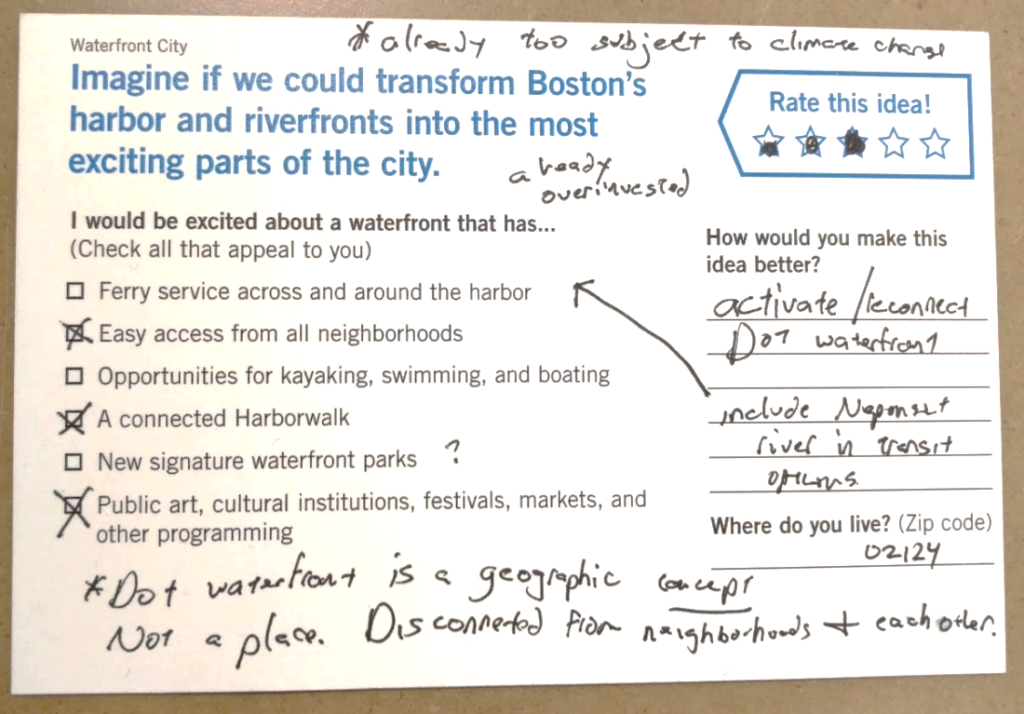 As we work toward finalizing the Imagine Boston 2030 plan this spring, we still want to hear from you! Did you participate in this activity? Share your experience on Twitter, Facebook, and Instagram using #ImagineBoston. And as always, don’t forget to sign up for Imagine Boston updates!