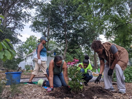 The Edgewater Neighborhood Association and Boston Food Forest Coalition held a welcoming event celebrating Phase I of the Edgewater Food Forest at River Street, located behind 640 River Street in Mattapan. The food forest is being created by the neighborhood association in what had been an empty field. It was an exciting event with planting, a tour, and a brass & wind performance from a local church's youth orchestra. The site has walnut trees and a processing station, fruit trees and bushes, a rain catchment system, and a gazebo for community events. The food forest was made possible in part by a $125,000 investment from the City.