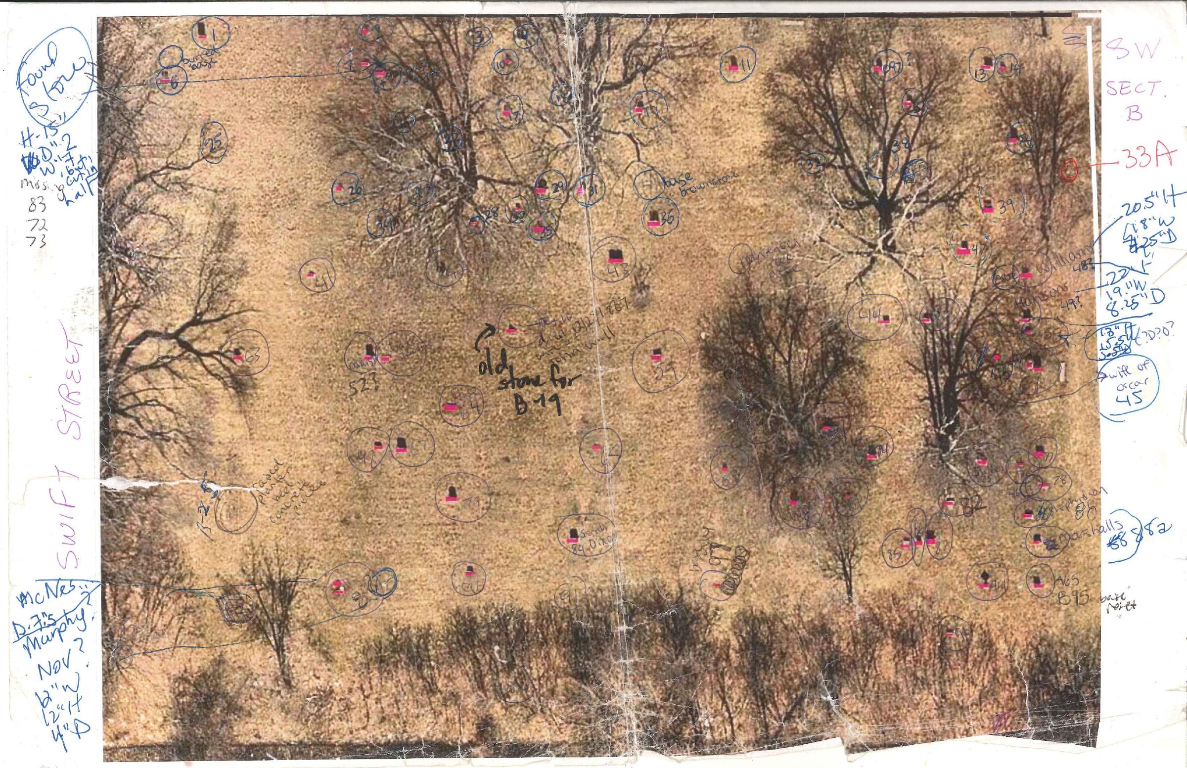 In order to figure out which gravestone was which, it was necessary to do site work and identify every stone. There are approximately 450 grave markers in the site. I was fortunate to have a volunteer, Emma Jansen, to help me. In the site survey, the cemetery is divided up into four quadrants (A, B, C, and D) and each location number includes the site abbreviation (BS), the quadrant letter, and the gravestone number within that quadrant (i.e. BS-C-44). I divided the aerial map into the four quadrants and printed each section on 11” x 17” paper. We photographed each gravestone to upload the images to the online database; the photos also helped me identify difficult-to-read gravestones later in the office. Working section by section, we wrote the location number of each stone we could identify on the paper map. On the first attempt, we could identify about 75% of the gravestones.