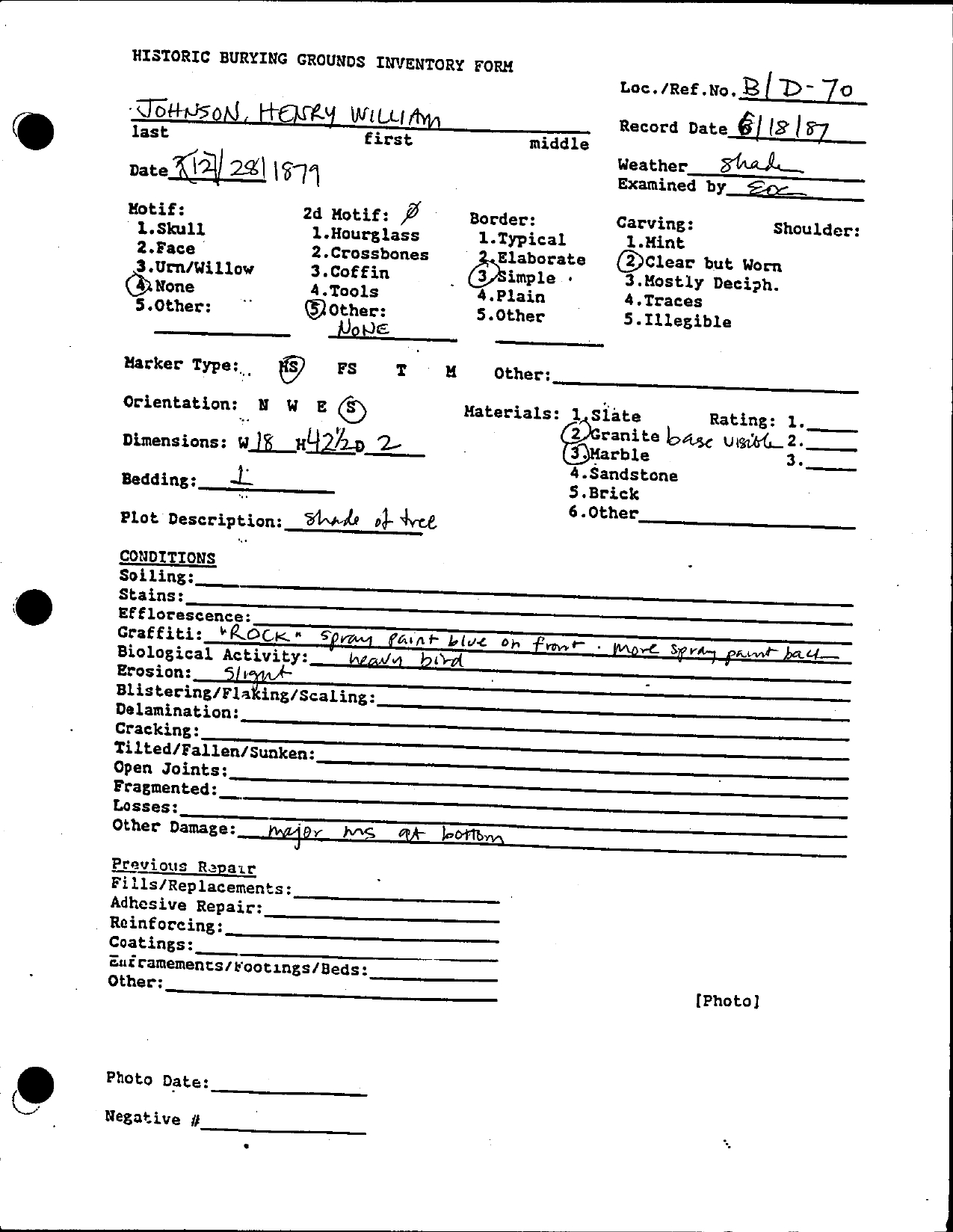 To help us identify the gravestones we used data from the grave marker survey done in 1987. The gravestone survey sheet has a form on the front side of the page listing the location number, name of the deceased, date of death, type of stone, measurements, motifs, degree of legibility, and other details. The back of page contains the epitaph and sometimes a sketch of the gravestone. This information had been compiled into lists of all grave markers in the site, organized in three ways: alphabetically by last name, chronologically by date of death, and spatially according to location number. Even though all three lists contain the same information, they were all helpful in correctly identifying the gravestones.