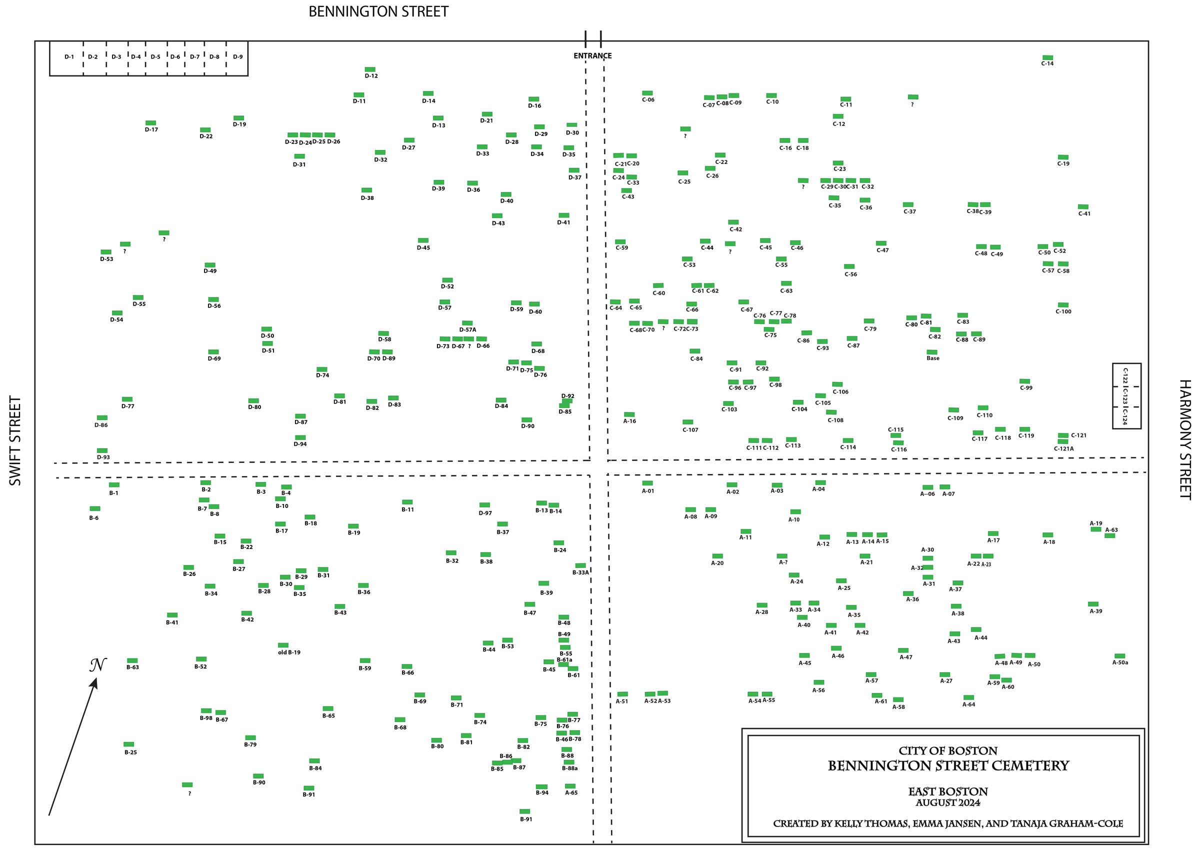 In the 1980s, the Historic Burying Grounds Initiative (HBGI) undertook a survey of all 16 of the burying grounds in the HBGI program. A survey sheet was created for each gravestone that recorded important details about the marker and assigned a location number to it. Site maps were created using the location numbers. Although a survey took place in Bennington Street Cemetery in 1987, a map based on this survey was never created. An older, undated map for this cemetery does exist, indicating some burials from the 19th century and early 20th century, but this map is difficult to read and does not include all of the headstones. None of the burials on that map are marked with location numbers.