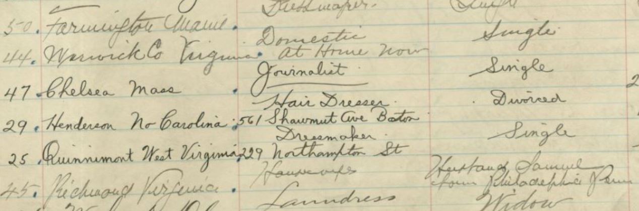 Ward 13's newly registered voters worked as clerks, journalists, musicians, telephone operators, cherry pitters and pickers, Boston Public School teachers, elevator operators, housewives, seamstresses, department store salesladies, laundresses, and more.
