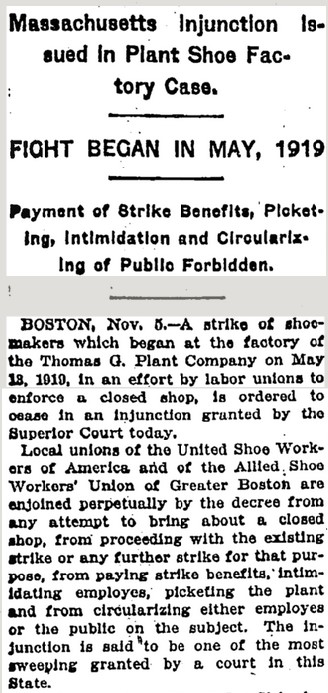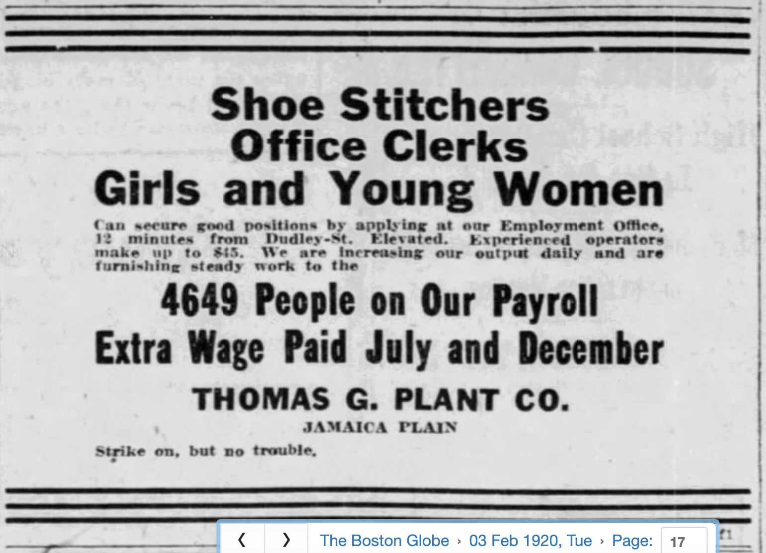 Many of Ward 15's new voters worked in local shoe factories, including as many as 48 women who indicated that they were employed at Jamaica Plain's Thomas Plant Shoe Factory. Workers employed at the Plant factory, located at the corner of Centre and Bickford Streets, had been on strike since early 1919. In an attempt to continue production despite the strike, the Plant Company advertised for new workers, with ads assuring prospective workers "strike on but no trouble."
