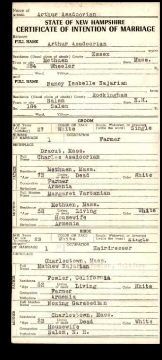 The final record we found in our search for Nazenig is a 1940 certificate of marriage intention for her middle daughter Nancy Najarian. The certificate lists Nancy's birthplace as Charlestown, Massachusetts and her parents as Nazenig Garabedian Najarian and Matthew Najarian. At the time of Nancy's marriage intention, her father Matthew is listed as living in Fowler, California and his occupation is "farmer." Her mother Nazenig is listed as deceased at age 23, confirming that the 1921 gravestone in Lawrence is, indeed, Nazenig's. Interestingly, Nancy also lists her father's place of birth as Armenia. Her groom, Arthur Asadoorian, also lists both his parents as being born in Armenia.