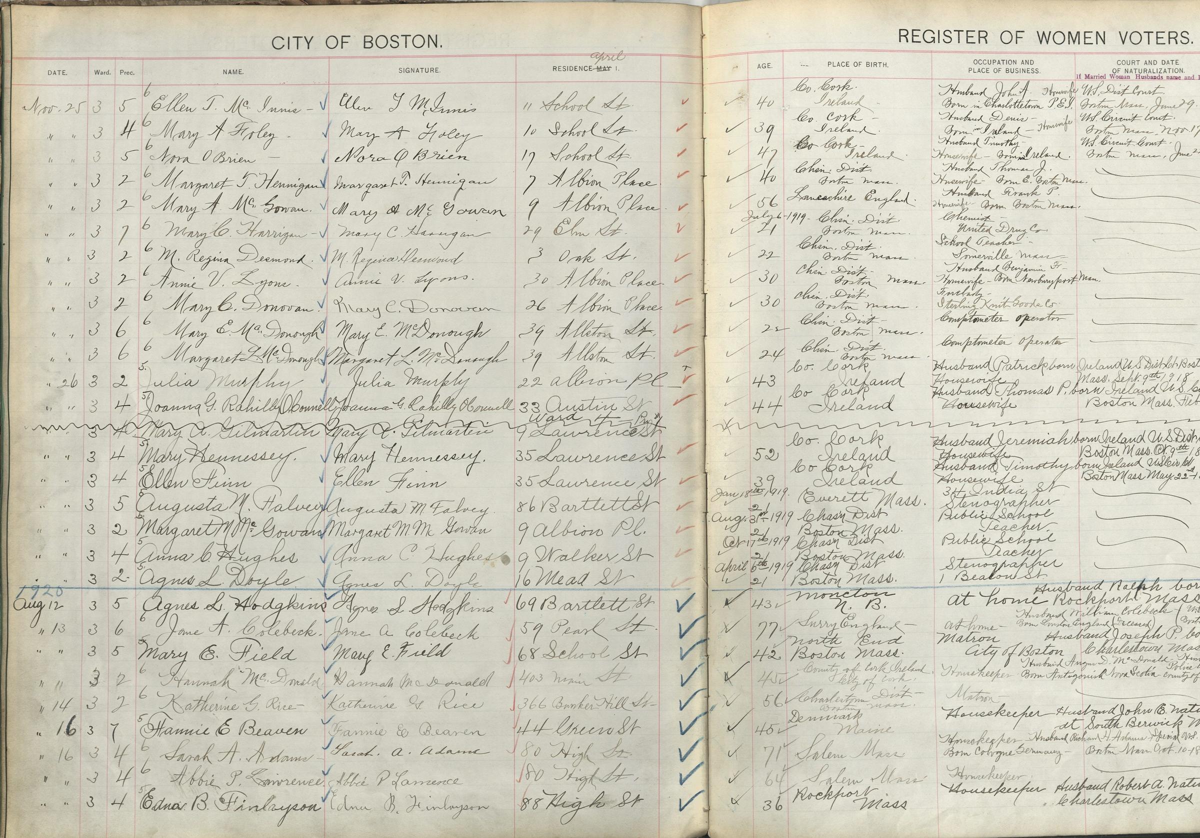 In August of 1920, the month that Tennessee ratified the 19th Amendment, the women of Boston began registering to vote. Women registered by the thousands, and on October 13, 1920, the last day to register before the 1920 presidential election, over 50,000 Boston women had registered to vote.