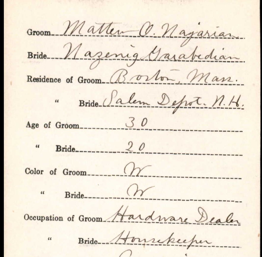 Behind every entry, there is a story! Nazenig Najarian registered to vote on October 6, 1920. She listed her birthplace as Salem, New Hampshire. She also listed her husband as Matthew Najarian, born in Armenia, and naturalized in 1917 in the Manchester, New Hampshire Superior Court. Some additional research fills out Nazanig's story.