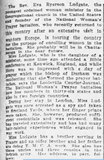 After her ordination, Ludgate founded the Women’s International Prayer Battalion. During World War I, she traveled to France, the Netherlands, Germany, Scotland, Ireland, and England. She preached and ministered to both military members and civilians, and the Harvard Crimson referred to her as “the most popular woman speaker to troops while in Paris." While in England, Eva's story took an intriguing turn when she was arrested by Scotland Yard on suspicion of espionage!