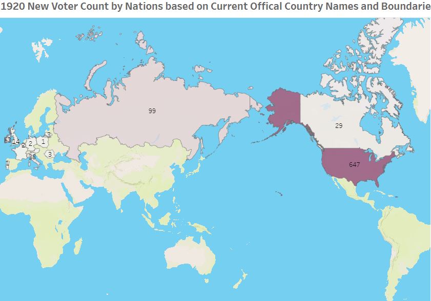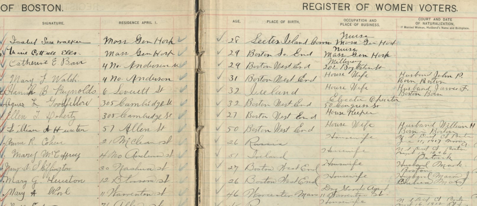 In 1920, after the passage of the 19th Amendment, over 50,000 Boston women registered to vote. The 1920 Women's Voter Registers now live at the Boston City Archives and document women's names, addresses, places of birth and occupations. Sometimes women provided additional information about their naturalization process to become a US citizen, including where their husbands were born because in 1920, a woman's citizenship status was tied to her husband's nationality.
