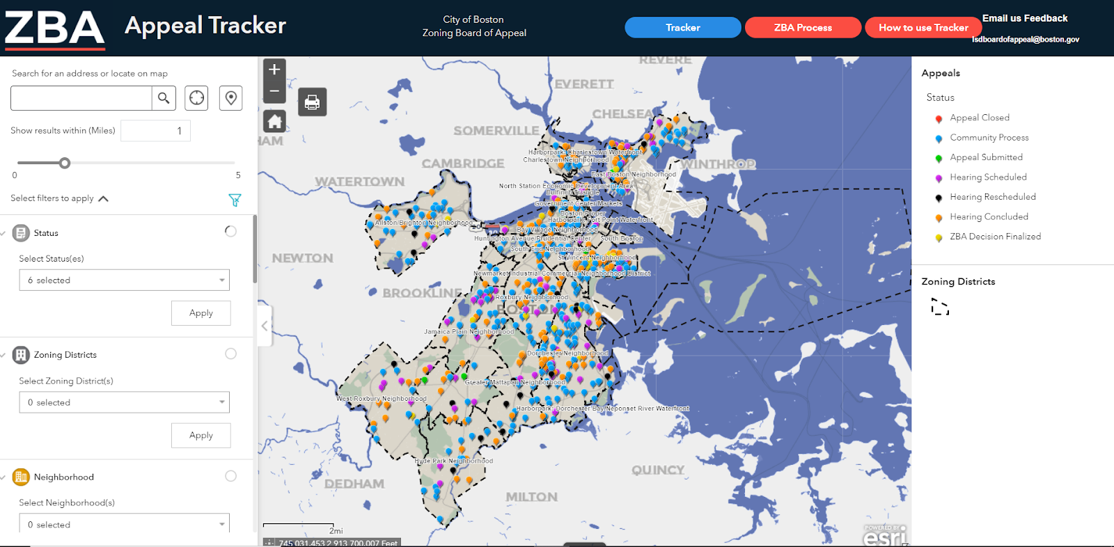 BOSTON - Monday, January 25, 2021 - Mayor Martin J. Walsh today announced the Zoning Board of Appeal (ZBA) project tracker is now available online. With the creation of the online tool, this fulfills the requirements set forth in Mayor Walsh’s Executive Order Relative to the Zoning Board of Appeal. This new tool will increase access to information related to proposed projects seeking relief from the Zoning Board of Appeal. The tracker is designed for anyone to quickly search for a specific appeal that has been submitted to the ZBA, or to search for appeals based on criteria such as location or applicant, in order to identify the status of the appeal.