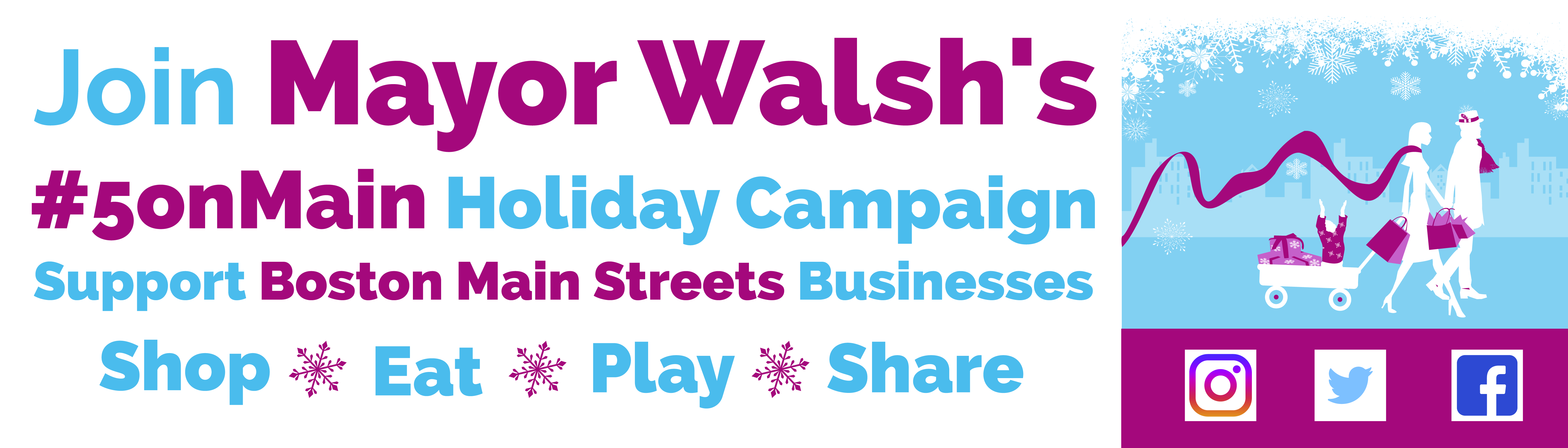 Mayor Walsh's "#5onMain" challenge is designed to inspire holiday shoppers to support Main Streets and other local commercial districts during the holiday season. Participants pledge to support local businesses at least five times during the holiday season, either by purchasing gifts, dining or participating in local holiday events in Main Streets districts. Holiday shoppers are encouraged to accept the challenge via social media, using the hashtag "#5onMain."