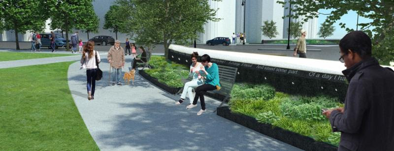 As part of the project, four plazas, each featuring planters and seating, will be built on the four corners of the intersection. Poetry will be engraved on each of the four planters, and each poem will reflect one of the four seasons.