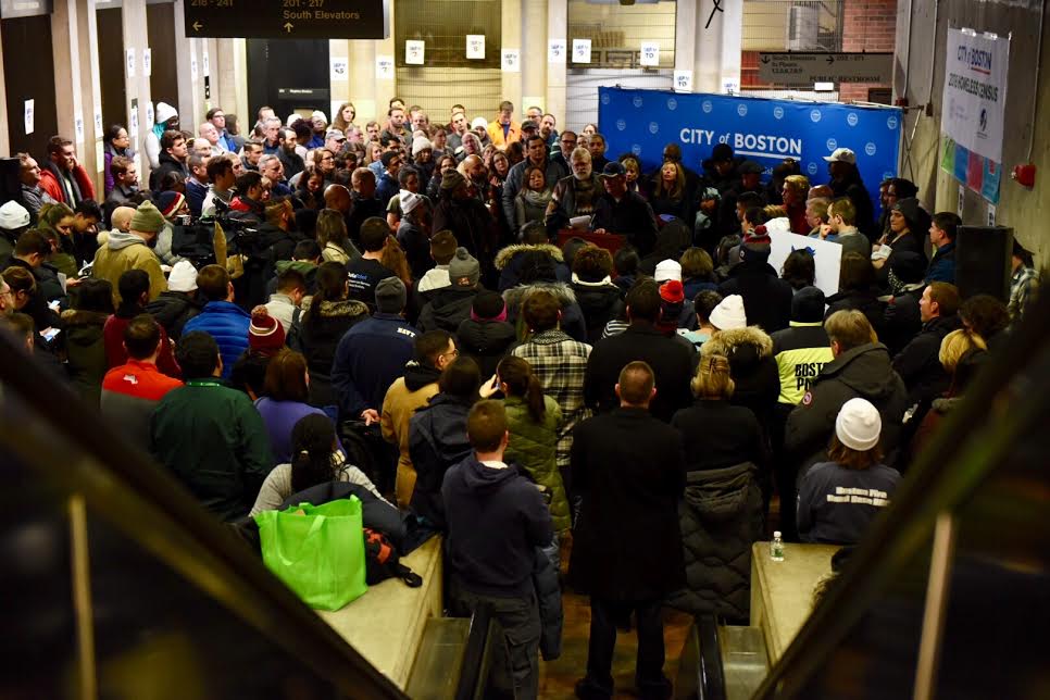 As part of Boston's efforts to end chronic and veteran homelessness, on Wednesday night Mayor Martin J. Walsh led a group of 300 volunteers, including City of Boston cabinet and department heads, State officials, homeless service providers, and community, civic and faith leaders in the City of Boston's 38th annual Homeless Census. This yearly count of individuals living on the street is part of a larger census of homeless adults and families in emergency shelters, transitional housing, and domestic violence programs.