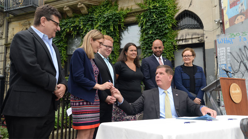 Mayor Martin J. Walsh today signed the City's $3.15 billion Fiscal Year 2018 budget, which through strong fiscal management and strategic savings initiatives allows for further investment in quality City services in neighborhoods across Boston, and builds on the success of existing City programs. During a signing ceremony hosted outside of a building marked by graffiti, Mayor Walsh joined members of his Cabinet and City staff, neighbors, community partners and local elected officials for the signing ceremony, that concluded with the graffiti busters team removing the graffiti from the wall.