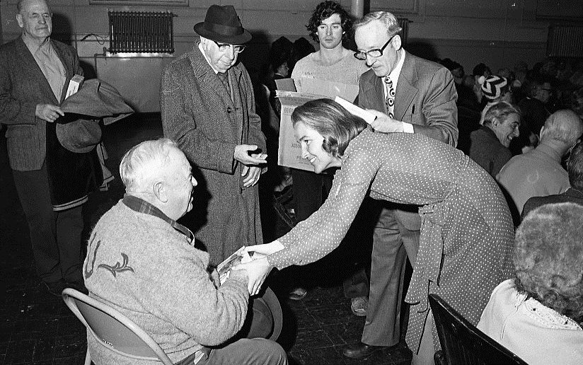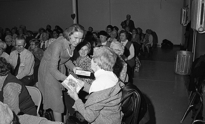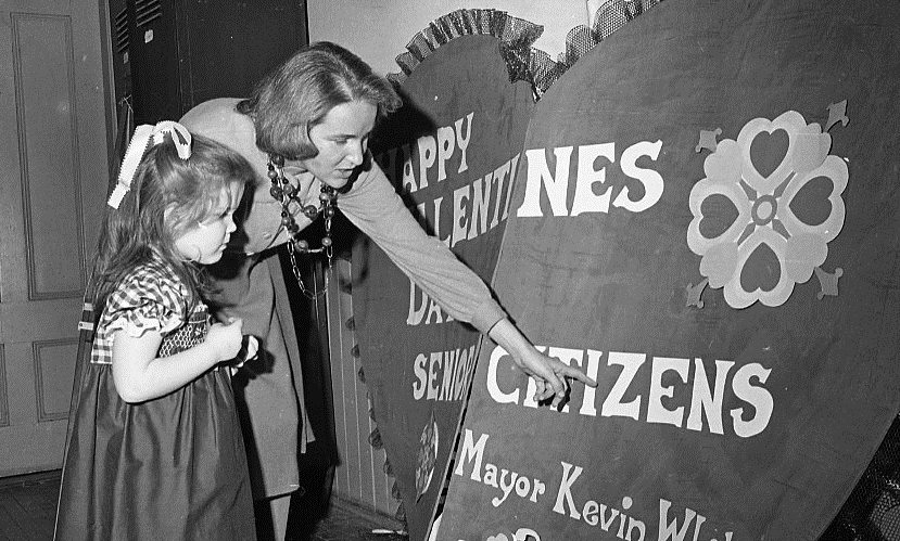 During her husband’s tenure as Mayor of Boston, Kathryn White became active in the City’s Elderly Commission. She advocated for more services for the elderly, including transportation to hospitals and hot meal delivery. In 1979, in addition to acting as first lady, she took a part-time job consulting for Boston University Medical Center on issues involving the elderly. Evidence of Kathryn’s advocacy for Boston’s seniors is found in her husband’s mayoral records, which are held by the City Archives. For example, these photographs, taken in 1975, show Kathryn White visiting a group of elderly Bostonians in her native Charlestown on Valentine’s Day.