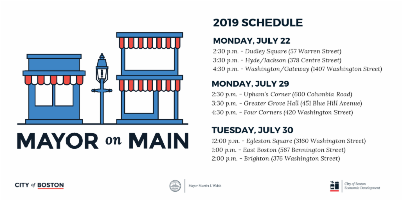 Mayor Martin J. Walsh today announced new dates for the "Mayor on Main" trolley tour, which was rescheduled due to weather conditions. The three-day event which highlights Boston's Main Streets (BMS) districts every year is now set to kick off on Monday, July 22. During Mayor on Main, Mayor Walsh will visit businesses and present the 23rd Annual Boston Main Streets Awards, which recognize an outstanding business owner and volunteer from each district. This year's Mayor on Main tour will be held Monday, July 22, Monday, July 29, and Tuesday, July 30.