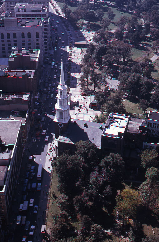Park Street Church's building and its distinctive steeple, based on the style of Sir Christopher Wren, became an iconic part of Boston's landscape. The church was untouched during the Fire of 1872. Its steeple is often visible in the background of historic photos of the city.