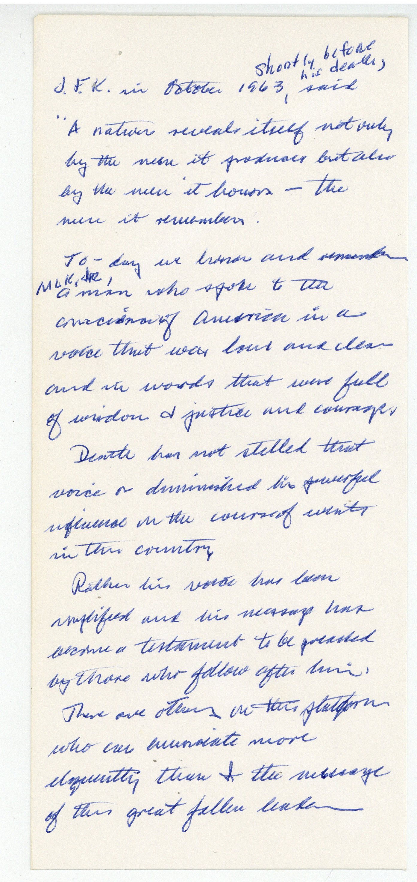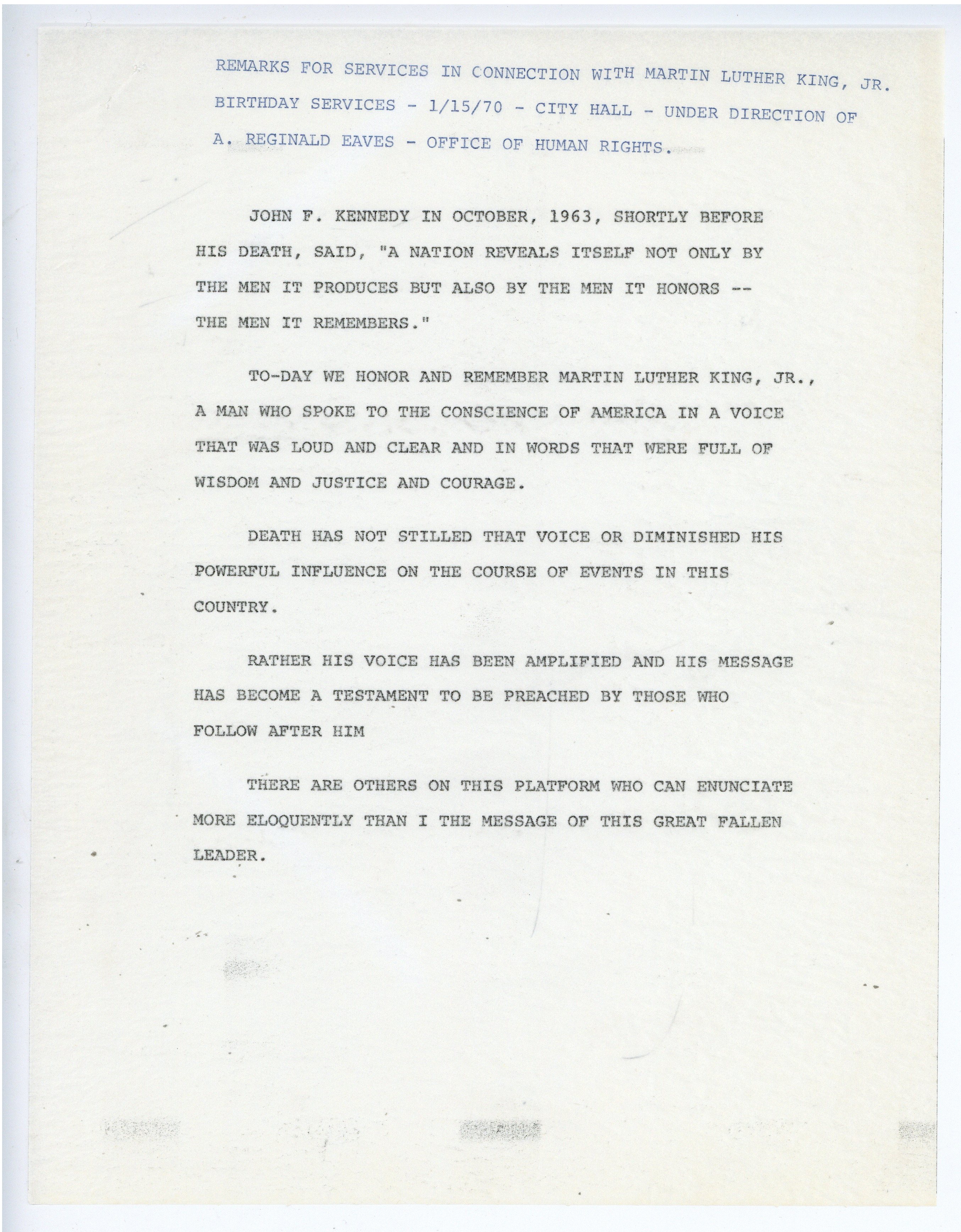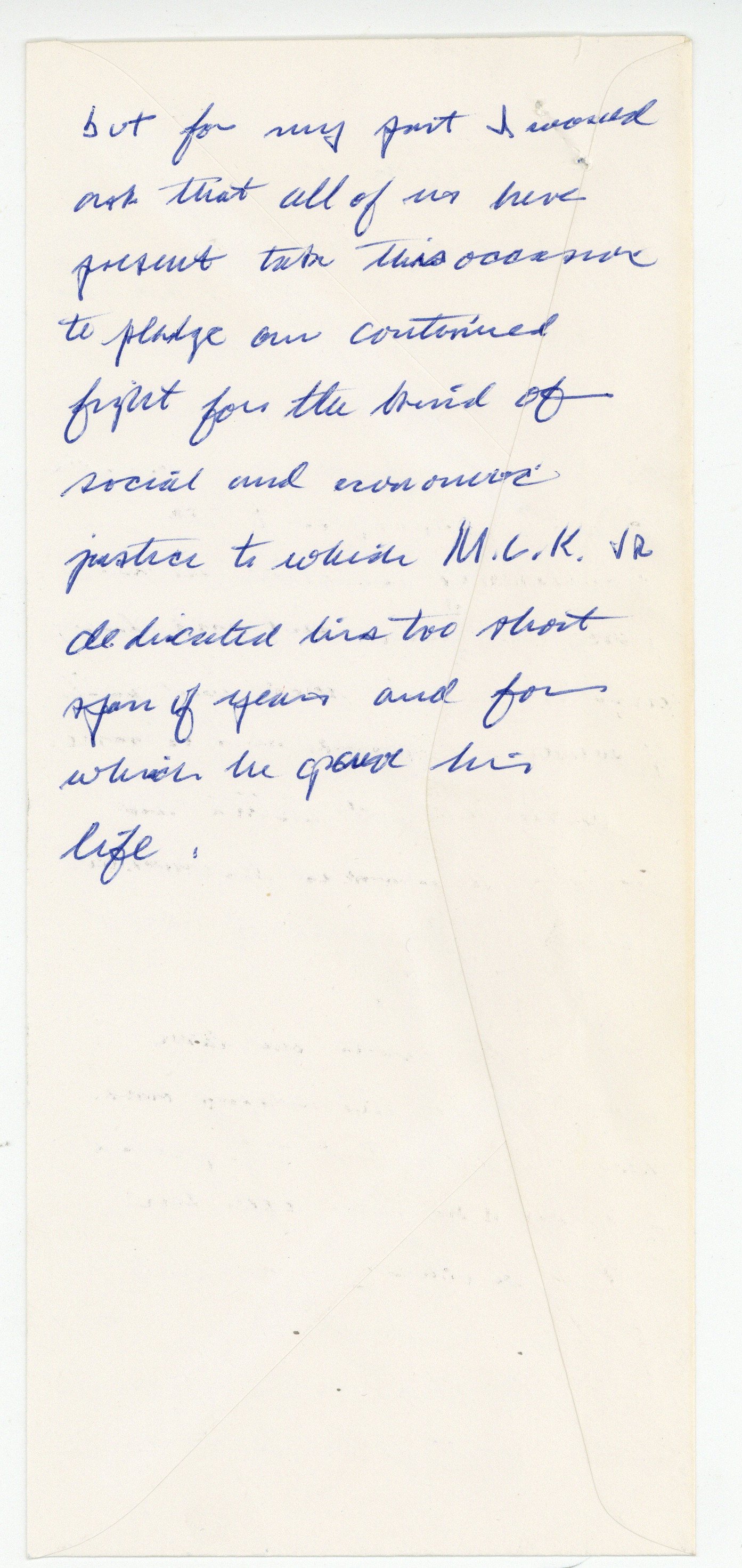 The City sponsored several events commemorating the work of Dr. King, including a service at City Hall. Mr. A. Reginald Eaves gave remarks at the service. He drafted his remarks on the back of an envelope.