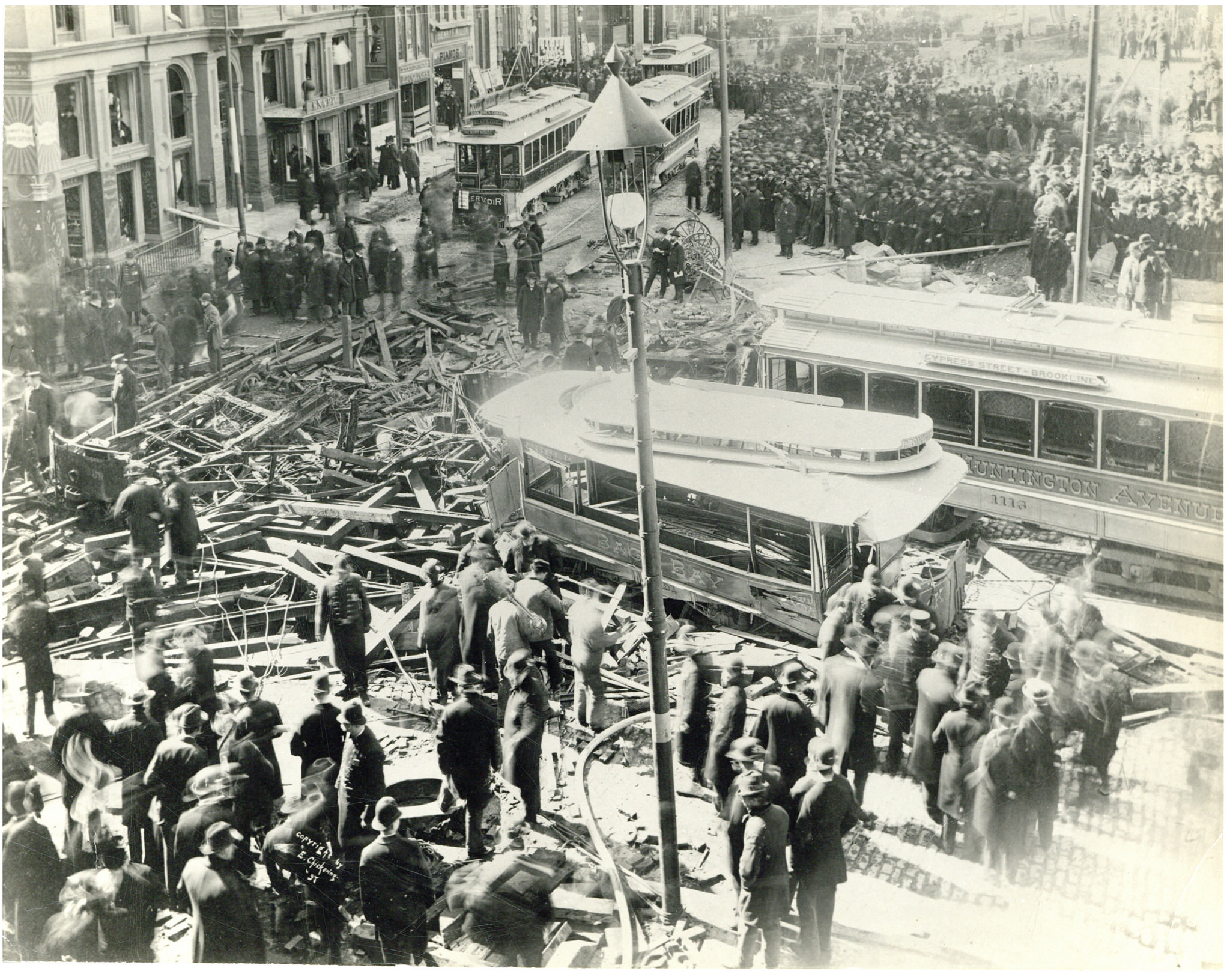 At 11:46 a.m. on March 4, 1897, a pocket of gas above the Tremont Street subway tunnel exploded. Underground construction caused leaking gas from nearby pipes to build up over time. A spark from a passing trolley ignited the gas that morning. Even though six people died at the scene, the tunnel itself escaped damage. Work on the subway resumed as planned. At the time, some people were skeptical about traveling underground. The City made an effort to reassure the public that the subway would be a safe way to get around the City.