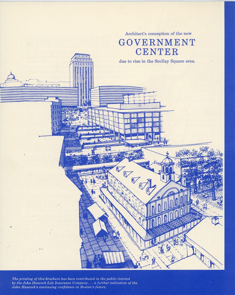 Government Center was a major part of Mayor Collins’s citywide redevelopment strategy. In 1959, consulting partners Adams, Howard, and Greeley drafted a report that recommended locations for