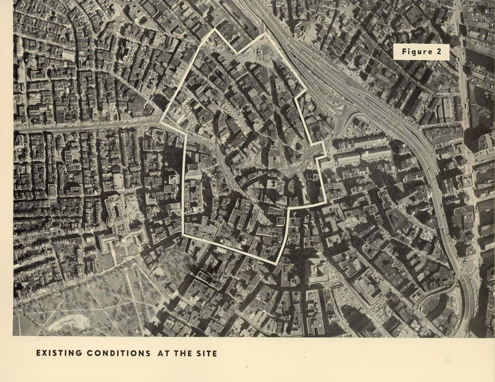 Page 11 from the report (above) shows an aerial view of Scollay Square. The area would eventually become Government Center.