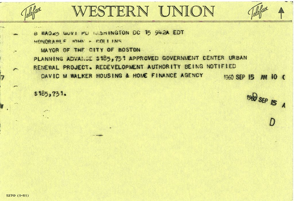 This message was sent by the Housing and Home Finance Agency to Mayor Collins in 1960. It shows how the City received an advance of $185,731 to begin its “Government Center urban renewal project.” Federal money partially subsidized the City’s plan for a modern civic center downtown. With loans of more than $21 million, the City bought all but one of the properties in Scollay Square for Government Center by 1962.