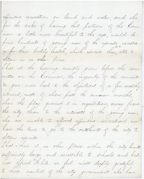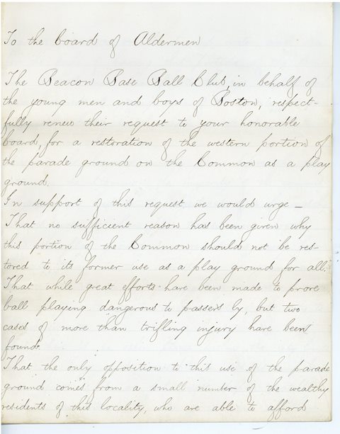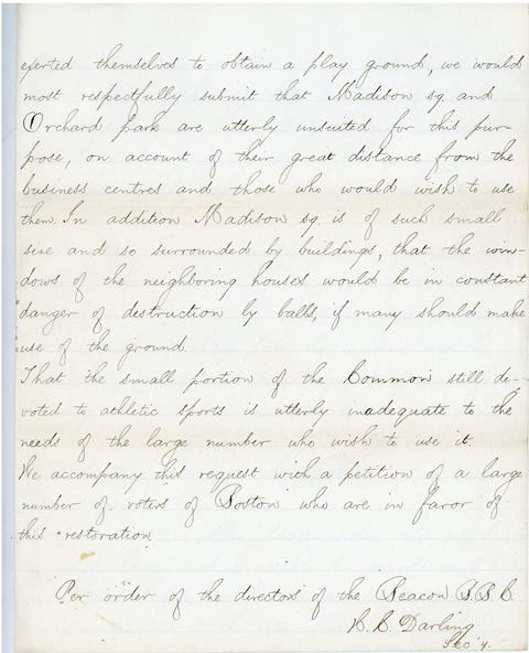 The Beacon Hill Baseball Club responded in the above letter. They stated that baseball was not a dangerous game and that “the only opposition…comes from a small number of the wealthy residents of this locality who are able to afford expensive recreation on land and water and who, for the sake of making the Common a little more beautiful to the eye, would deprive hundreds of young men of the exercise necessary for their bodily health, which exercise they are able to obtain in no other place.”