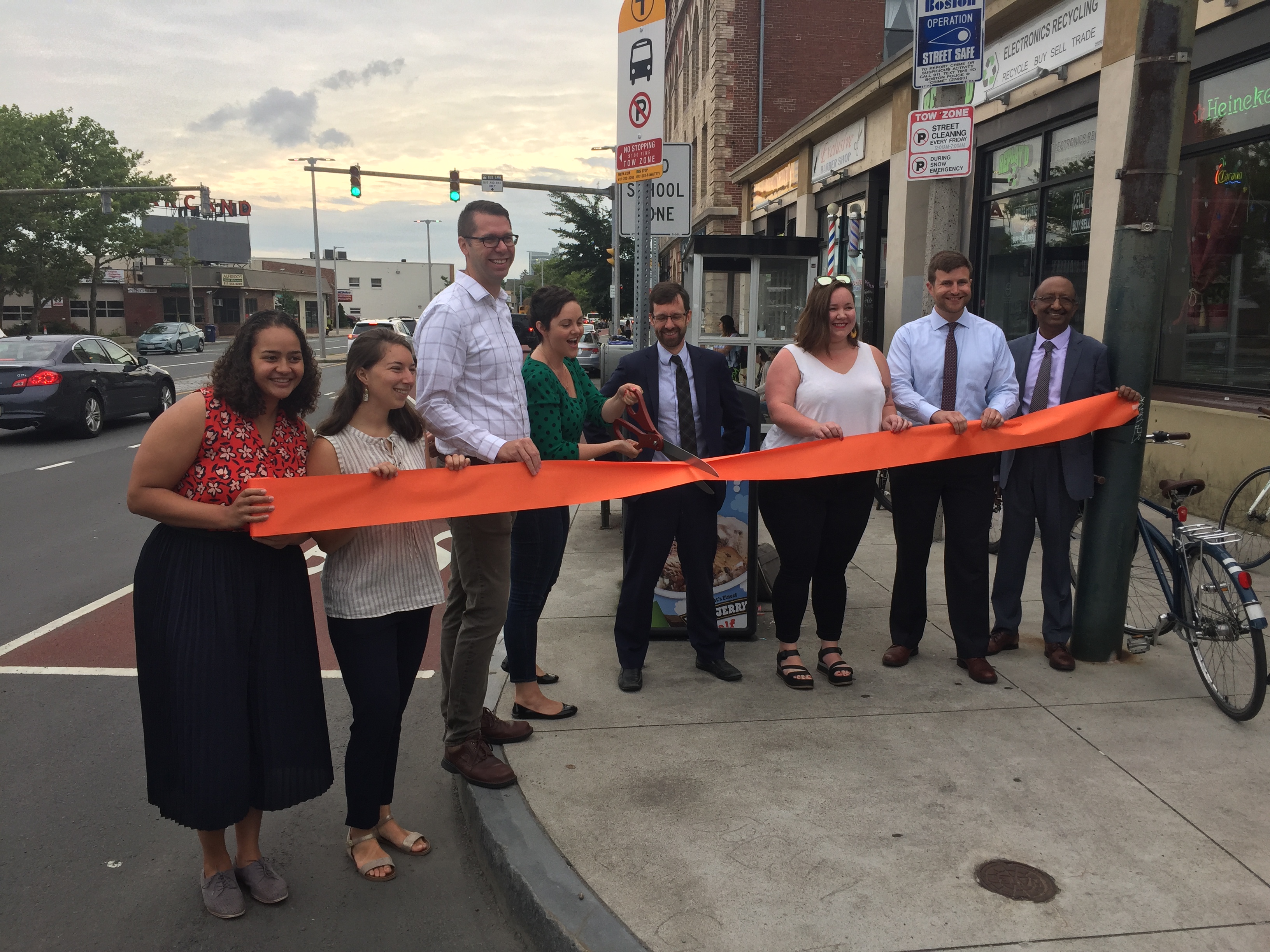 Boston Transportation Department, MBTA and Liveable Streets join the Allston/Brighton community on Brighton Avenue to commemorate the recent completion of the new lane