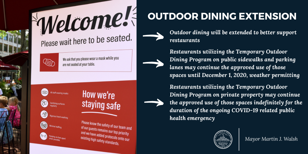 Mayor Martin J. Walsh today announced the outdoor dining season in the City of Boston will be extended past the original closure date of October 31 to better support restaurants during the ongoing COVID-19 public health emergency. This extension applies to outdoor dining on both public and private property.