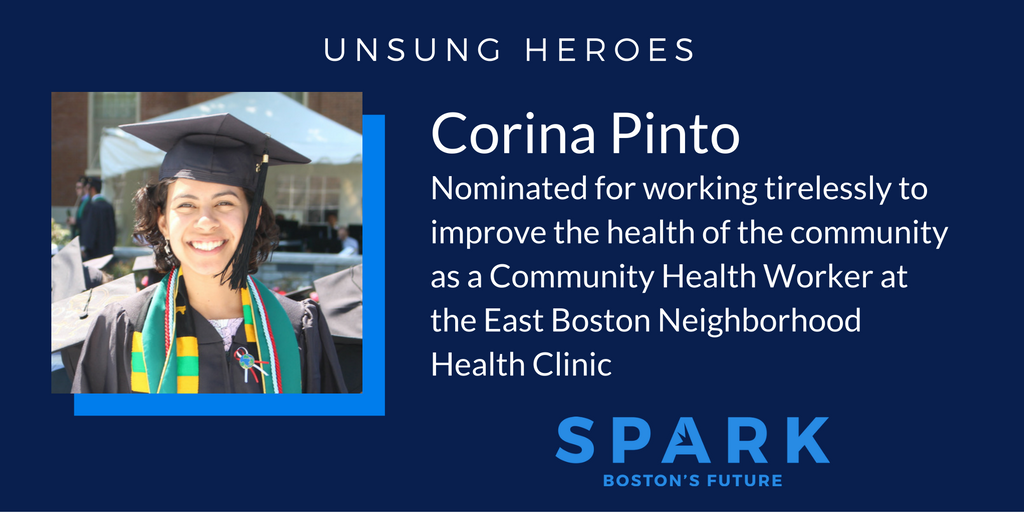My name is Corina Pinto. I am a Community Health Worker at the East Boston Neighborhood Health Center. I work with families whose child or children have asthma to better manage their symptoms and keep them out of the hospital. Through this work, I have been exposed to the social determinants of health that keep residents of our city from living a happy and healthy life, such as poor housing conditions, food insecurity, immigration status, violence, etc. Part of my work is to conduct home visits; as of today, I have been in over one hundred of our patients homes throughout the Metro Boston area.
