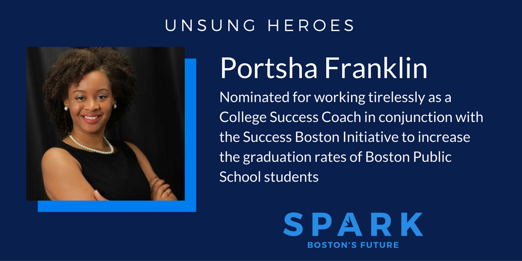 My name is Portsha Franklin. I am an advocate for educational opportunities and access. I am a partner that strives to be the best for my mate. I am a niece, an aunt, a sister, a daughter, a granddaughter, and a great granddaughter. I work at West End House Boys and Girls Club on the Success Boston initiative, sponsored by The Boston Foundation. I advise students on MassTransfer, stand in long financial aid lines with students, review resumes, and partner with college administrators on how to best serve our students, just to name a few things.