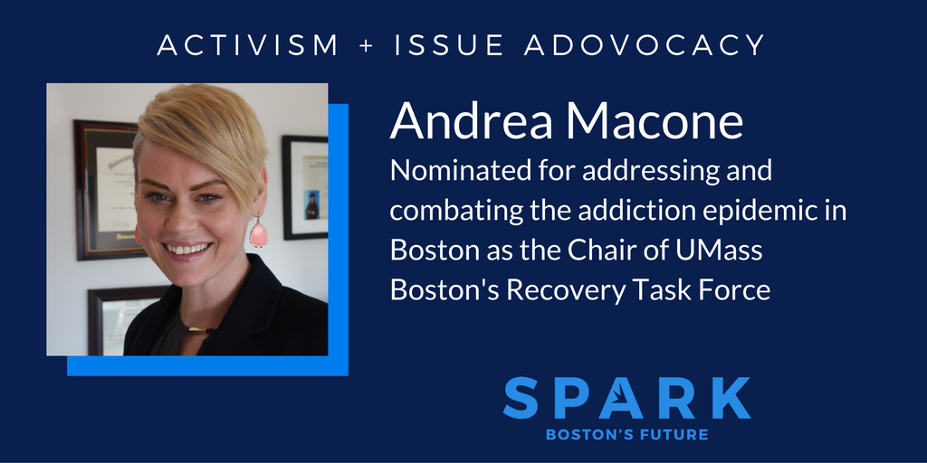 My name is Andrea Macone. I work at UMass Boston in the Office of Diversity and Inclusion, and I am a graduate student in American Studies and an Emerging Leaders Fellow in the College of Management's Center for Collaborative Leadership. I chair UMB's Recovery Task Force, a collaborative forum that seeks to create a safe and open environment for campus community members in or seeking recovery and their allies. We specifically focus on supporting individuals in their academic, personal and professional growth; advising key stakeholders; and engaging with the community.